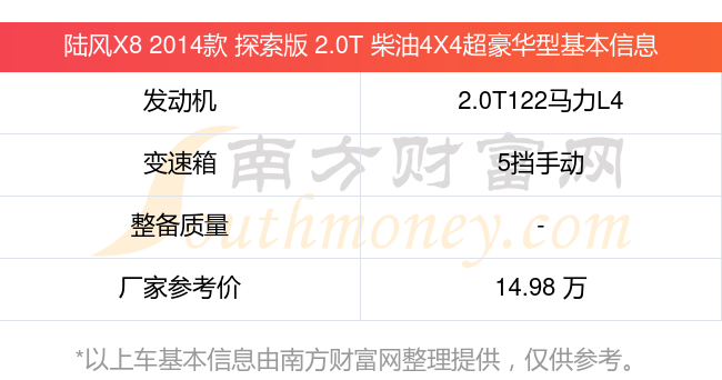 陆风X8 2014款 探索版 2.0T 柴油4X4超豪华型动力上搭载的是一台2.0T122马力L4涡轮增压发动机,匹配5挡手动挡变速箱,燃料形式为柴油,厂家参考价14.98万元。
