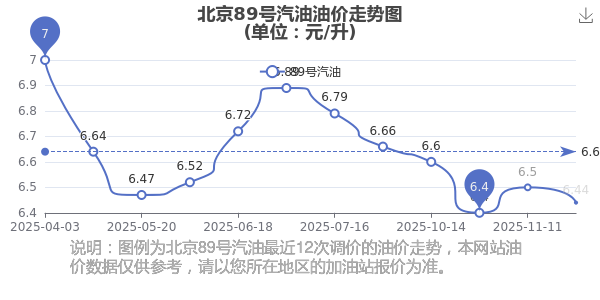 油价调整最新消息:11月25日北京汽油、柴油的价格是11月25日调整后的价格,每升价格为:92号汽油为6.89元,降了0.05元,降幅达0.72%;95号汽油为7.33元,降了0.06元,降幅达0.81%;89号汽油为6.44元,降了0.06元,降幅达0.92%;0号柴油为6.56元,降了0.06元,降幅达0.91%。北京下一轮油价调整时间12月8日24时,距离现在还有13.62天。