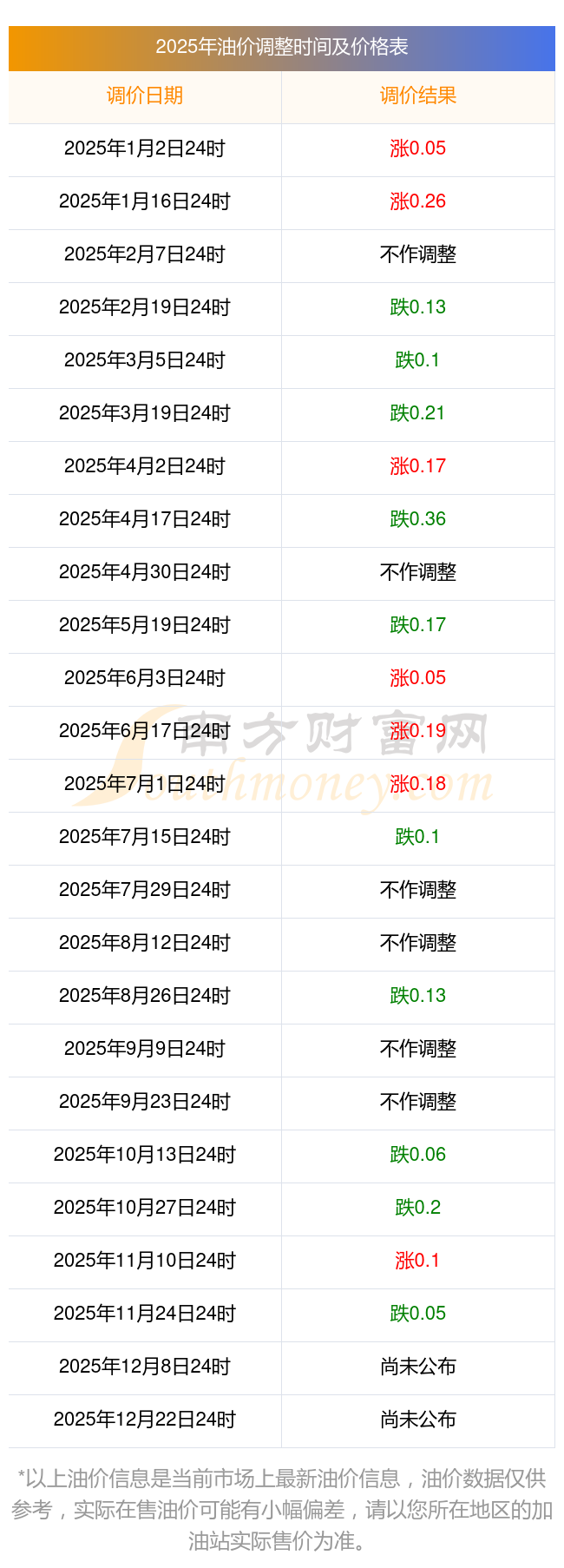 安徽汽油、柴油11月26日每升最新价格为11月25日调整后的价格,具体为:92号汽油6.85元,减了0.06元;95号汽油7.35元,减了0.05元;89号汽油6.42元,减了0.05;0号柴油6.56元,减了0.05元。下一轮油价调整时间12月8日24时,距离现在还有12.71天。