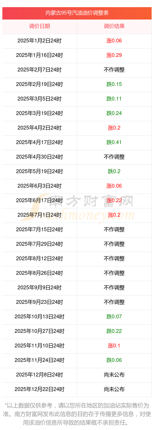11月27日,内蒙古95号汽油的价格是7.28元每升,本次的调整时间为11月25日,对比上次的调整下降了0.06元,下降0.817%,下次调整时间为12月8日24时,还有11.71天。