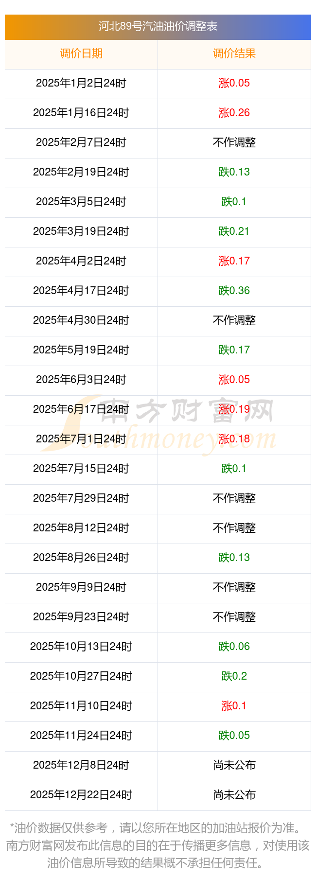 11月27日,河北89号汽油的价格是6.38元每升,本次的调整时间为11月25日,对比上次的调整跌了0.05元,跌0.778%,12月8日24时为下一轮油价调整时间,还有11.7天。
