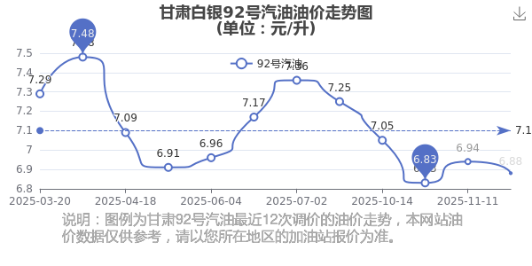 汽油、柴油11月27日每升的价格为(油价调整时间是11月25日):92号汽油6.88元;95号汽油7.34元;89号汽油6.36元;0号柴油6.44元。下一轮油价调整时间12月8日24时,距离现在还有11.68天。