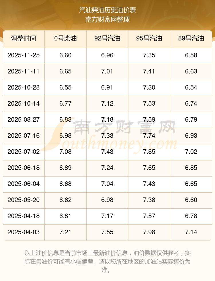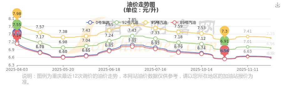 重庆合川95号汽油11月27日价格(11月25日调整后的价格):7.35元每升,对比上次调整(11月11日)的价格7.41元每升下降了0.06元,下降幅达0.81%。下一轮油价调整时间12月8日24时,距离现在还有11.67天。