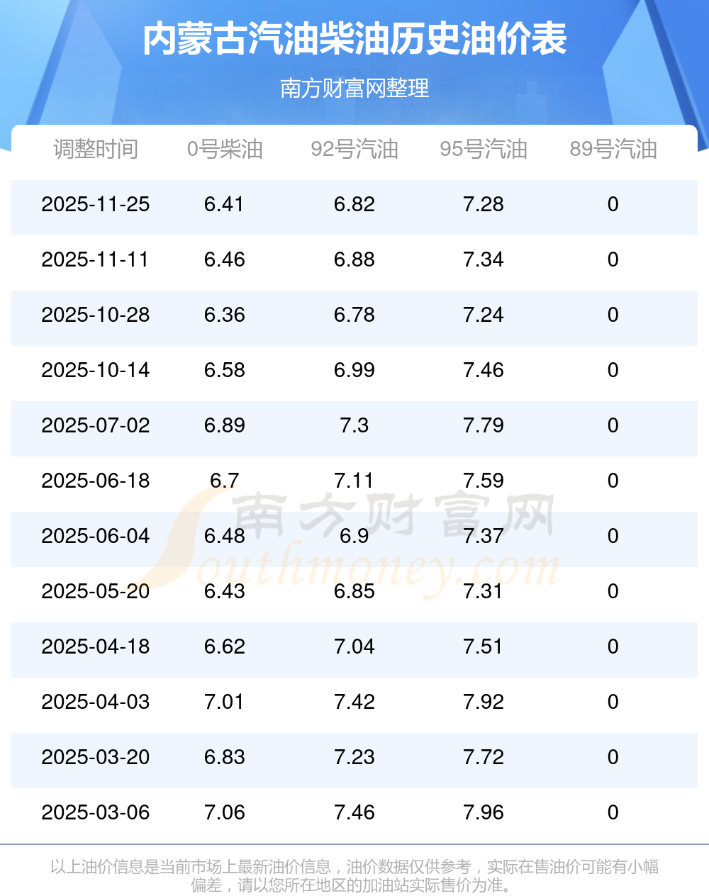 11月27日,内蒙古汽油、柴油每升最新价格为:调整时间为11月25日,92号汽油为6.82元,下降了0.06元,下降幅达0.87%;95号汽油为7.28元,下降了0.06元,下降幅达0.82%;0号柴油为6.41元,下降了0.05元,下降幅达0.77%。
