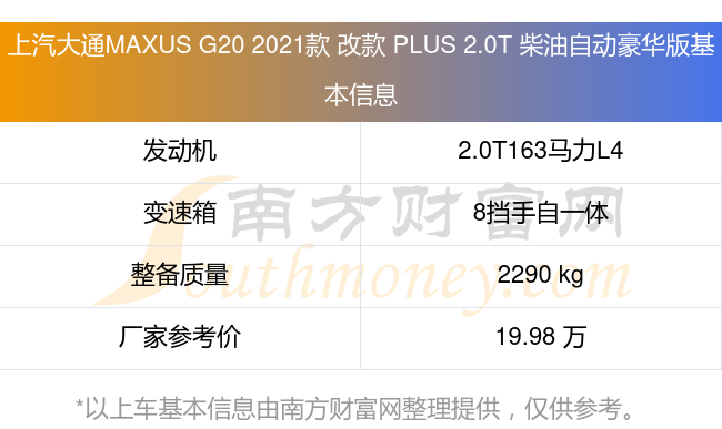 上汽大通MAXUS G20 2021款 改款 PLUS 2.0T 柴油自动豪华版动力上搭载的是一台2.0T163马力L4涡轮增压发动机,匹配8挡手自一体自动档变速箱,燃料形式为柴油,常规整备质量2290kg,厂家参考价19.98万元。