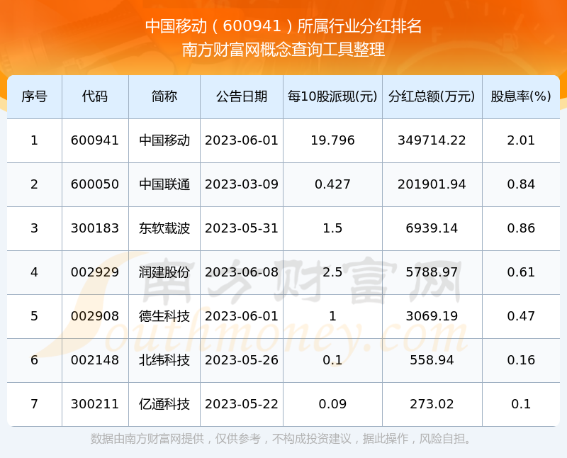 按照开云手机web版登录入口趋势选股系统统计,中国移动所属行业为通信服务行业,通信服务行业分红排名情况如下表: