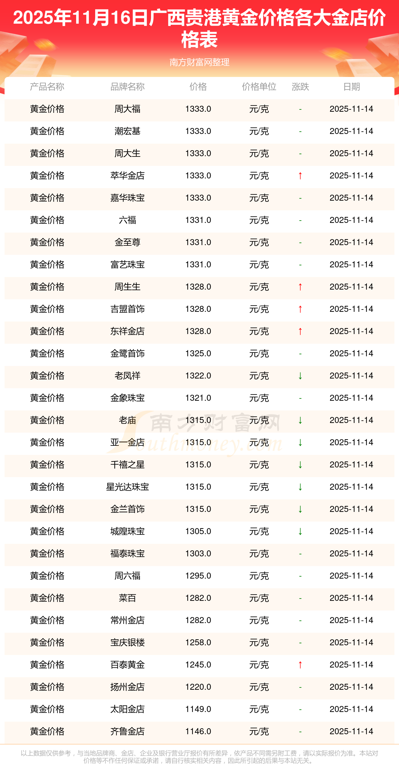 今天是2025年11月16日,广西贵港周大福、周大福、周大福、周大福、周大福、周大福、周大福、老凤祥、老凤祥、老凤祥、周六福等各大金店品牌黄金价格最新价格行情是这样的:周大福1333.0元/克、周大福646.0元/克、周大福1333.0元/克、周大福46320.0、周大福18410.0、周大福41780.0、周大福1167.0元/克、老凤祥1322.0元/克、老凤祥600.0元/克、老凤祥1322.0元/克、周六福1295.0元/克。