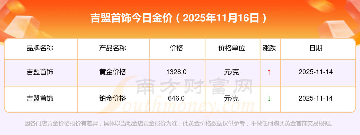 现在吉盟首饰黄金价格是多少钱1克_2025年吉盟首饰今日金价是多少钱一克,最新吉盟首饰查询,2025年11月16日吉盟首饰铂金价格现在每克多少钱?最新吉盟首饰铂金价格报价公布,一起来看看吧!