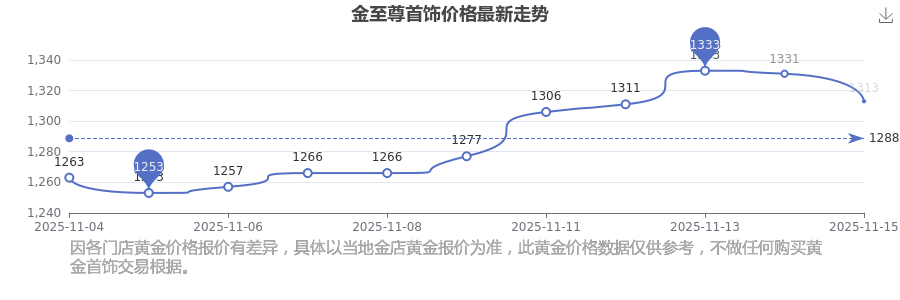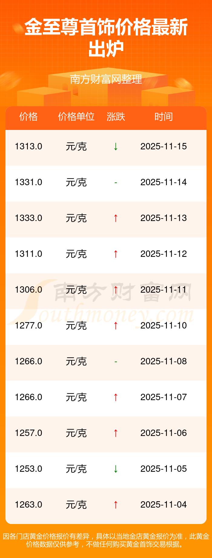 今日(2025年11月17日)金至尊首饰价格为1313.0元/克。