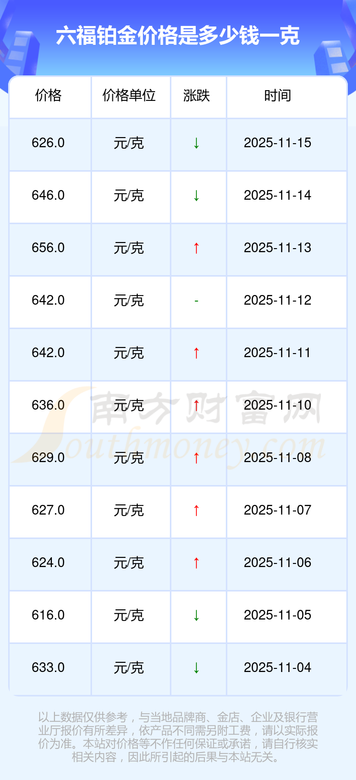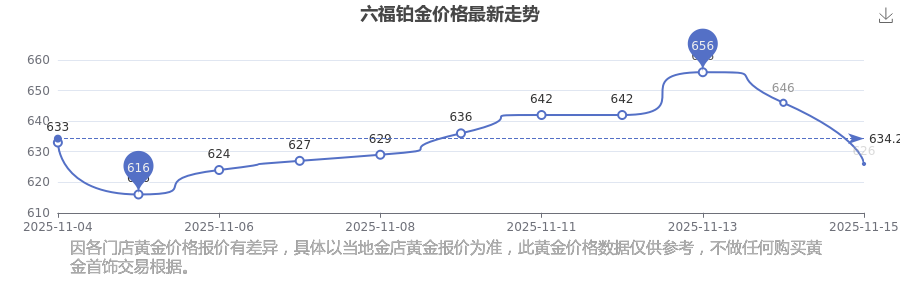 今日(2025年11月17日)六福铂金价格:626.0元/克。