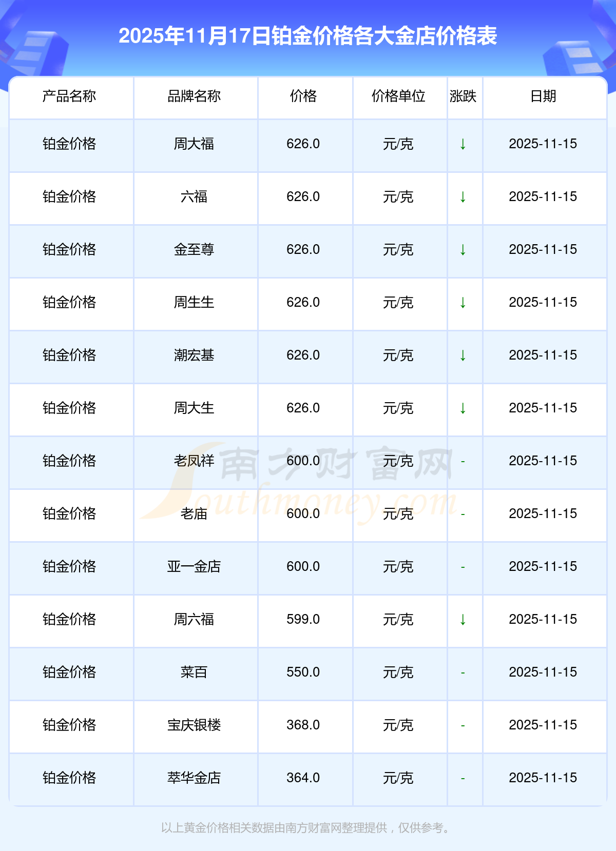 2025年11月17日各大金店铂金价格最新价格:周大福1315.0元/克,周大福626.0元/克,周大福1315.0元/克,周大福45190.0,周大福17850.0,周大福40760.0,周大福1151.0元/克,老凤祥1295.0元/克,老凤祥600.0元/克,老凤祥1295.0元/克,周六福1265.0元/克。