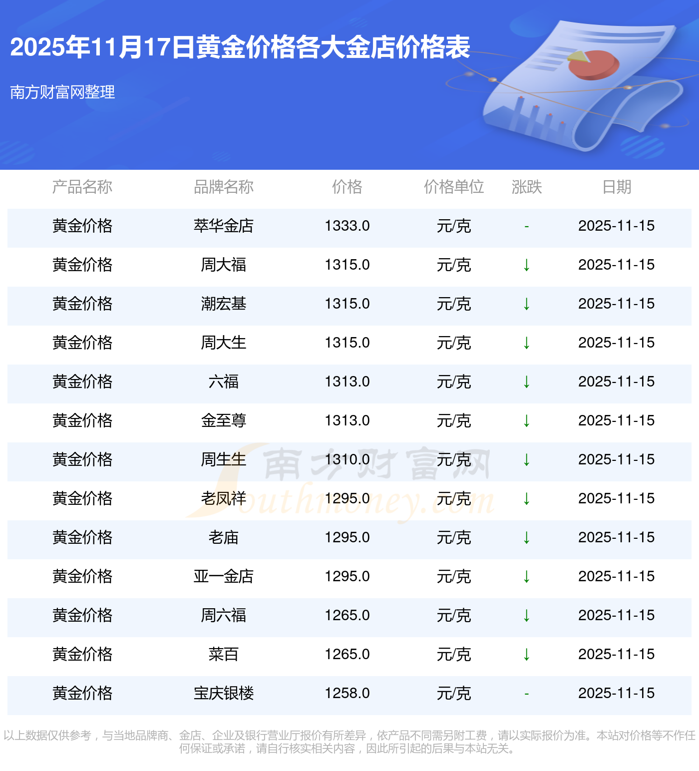 2025年11月17日周大福、周大福、周大福、周大福、周大福、周大福、周大福、老凤祥、老凤祥、老凤祥、周六福等各大金店品牌黄金价格最新价格如下:周大福黄金价格1315.0元/克,周大福铂金价格626.0元/克,周大福饰品金价(内地)1315.0元/克,周大福黄金饰品(香港)45190.0,周大福铂金价格(香港)17850.0,周大福金条价格(香港)40760.0,周大福金条金价(内地)1151.0元/克,老凤祥黄金价格1295.0元/克,老凤祥铂金价格600.0元/克,老凤祥足金价格1295.0元/克,周六福黄金价格1265.0元/克。