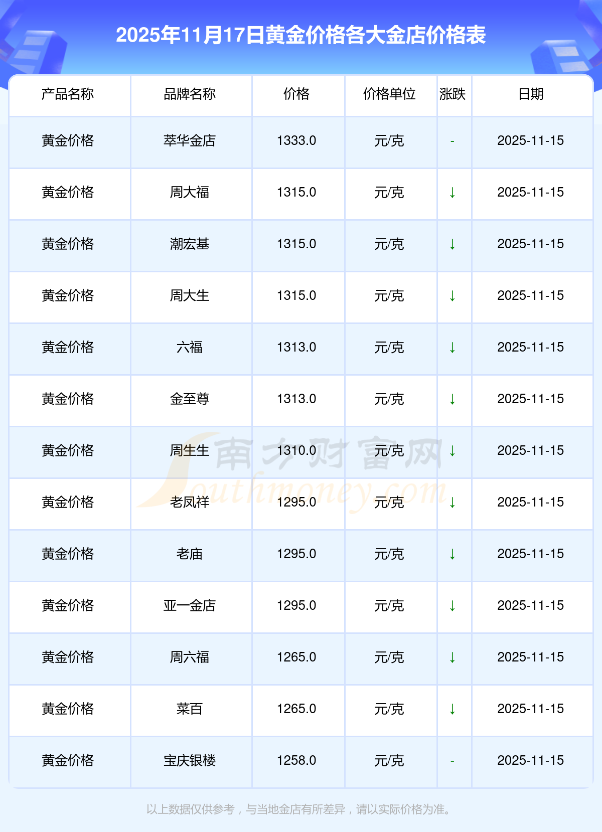 以上数据仅供参考,与当地金店有所差异,请以实际价格为准。