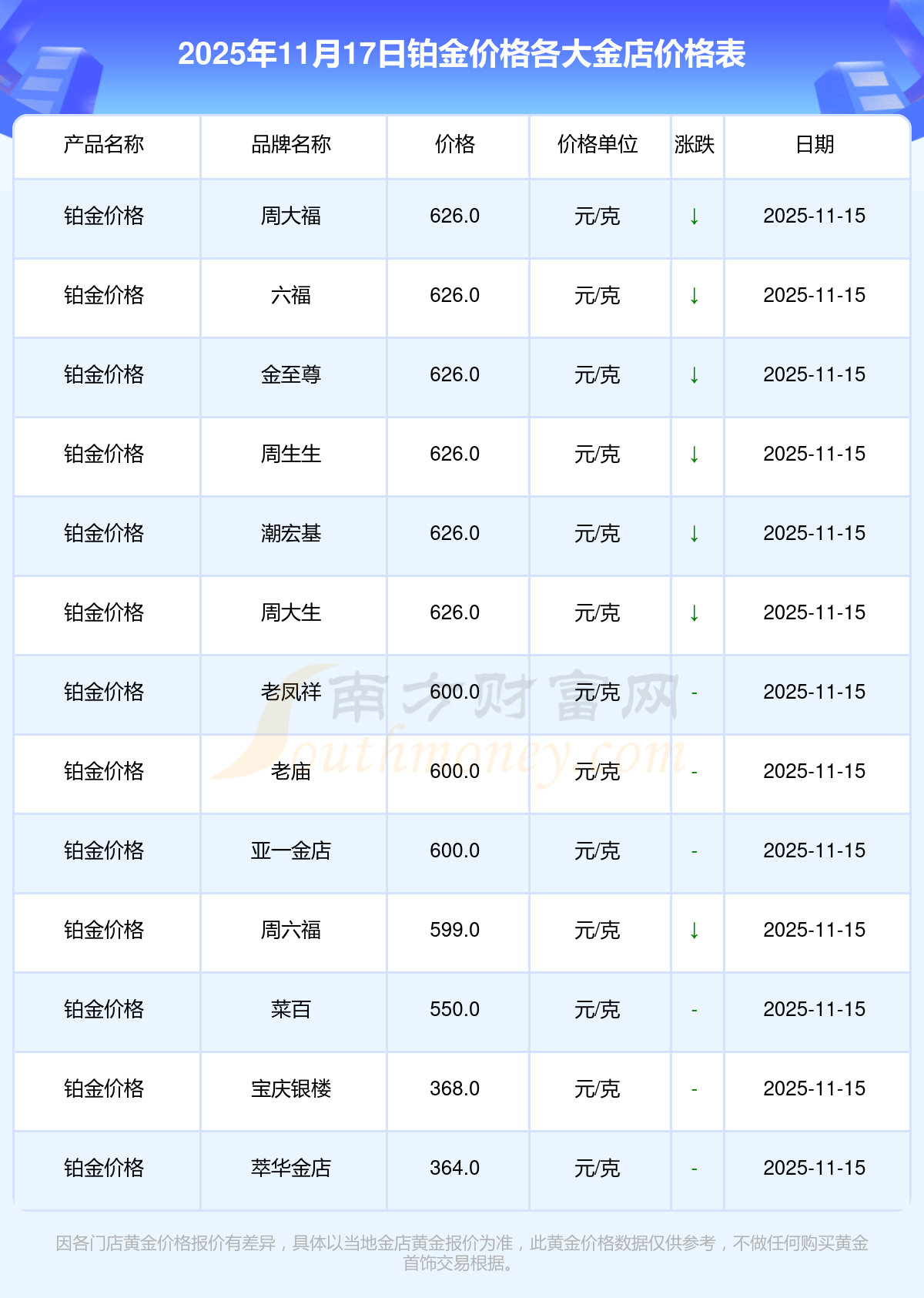 2025年11月17日周大福、周大福、周大福、周大福、周大福、周大福、周大福、老凤祥、老凤祥、老凤祥、周六福等各大金店品牌铂金价格最新价格如下:周大福黄金价格1315.0元/克,周大福铂金价格626.0元/克,周大福饰品金价(内地)1315.0元/克,周大福黄金饰品(香港)45190.0,周大福铂金价格(香港)17850.0,周大福金条价格(香港)40760.0,周大福金条金价(内地)1151.0元/克,老凤祥黄金价格1295.0元/克,老凤祥铂金价格600.0元/克,老凤祥足金价格1295.0元/克,周六福黄金价格1265.0元/克。