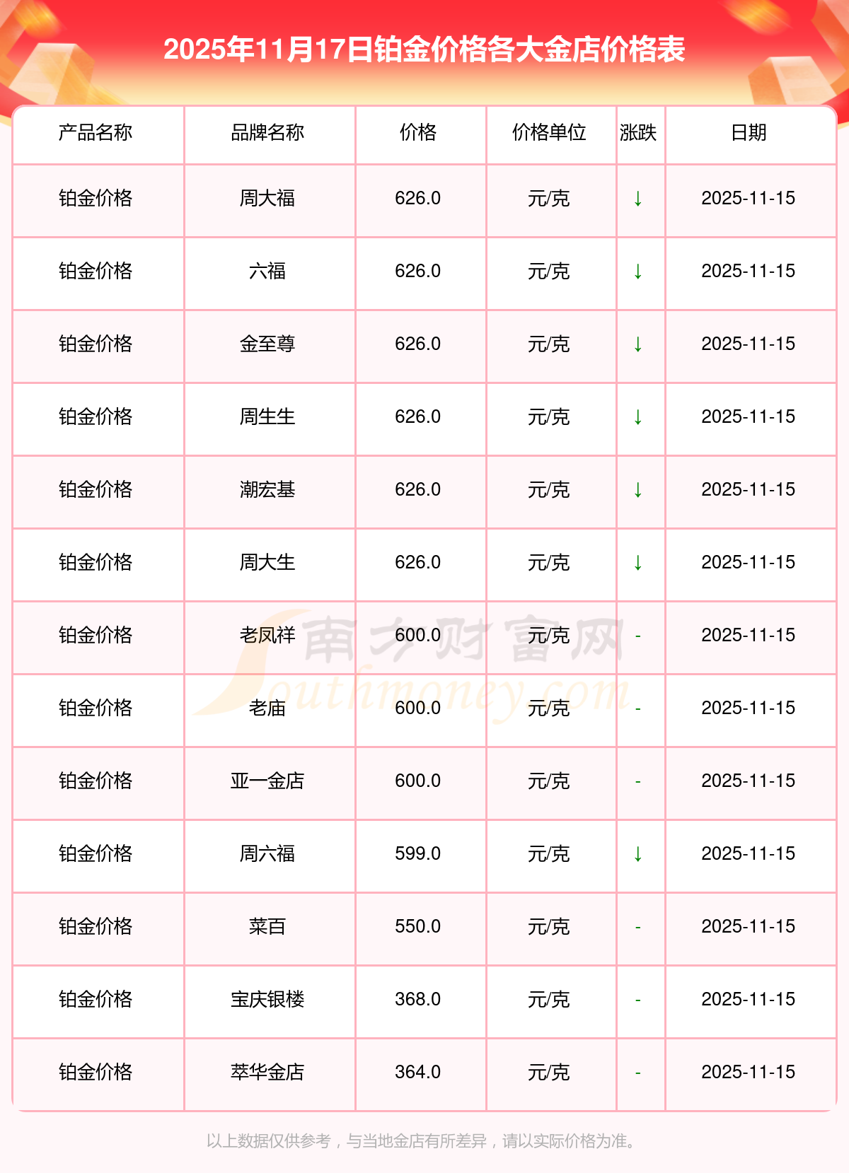 2025年11月17日,周大福、周大福、周大福、周大福、周大福、周大福、周大福、老凤祥、老凤祥、老凤祥、周六福等各大金店品牌铂金价格今日价格如下:周大福1315.0元/克、周大福626.0元/克、周大福1315.0元/克、周大福45190.0、周大福17850.0、周大福40760.0、周大福1151.0元/克、老凤祥1295.0元/克、老凤祥600.0元/克、老凤祥1295.0元/克、周六福1265.0元/克。