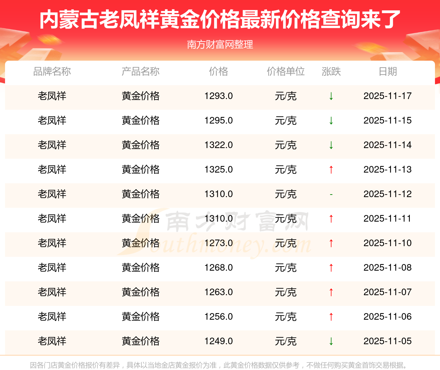 2025年11月17日,周大福、周大福、周大福、周大福、周大福、周大福、周大福、老凤祥、老凤祥、老凤祥、周六福等各大金店品牌黄金价格今日价格如下:周大福1305.0元/克、周大福626.0元/克、周大福1305.0元/克、周大福45350.0、周大福17860.0、周大福40910.0、周大福1141.0元/克、老凤祥1293.0元/克、老凤祥600.0元/克、老凤祥1293.0元/克、周六福1271.0元/克。