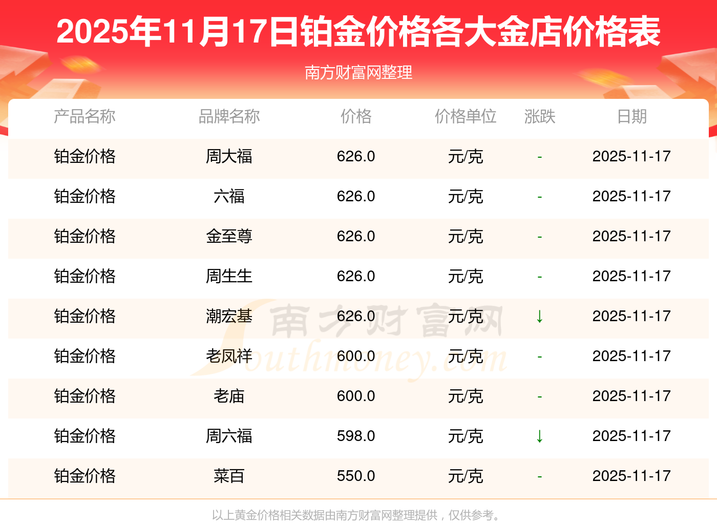 2025年11月17日各大金店铂金价格最新价格:周大福1305.0元/克,周大福626.0元/克,周大福1305.0元/克,周大福45350.0,周大福17860.0,周大福40910.0,周大福1141.0元/克,老凤祥1293.0元/克,老凤祥600.0元/克,老凤祥1293.0元/克,周六福1271.0元/克。