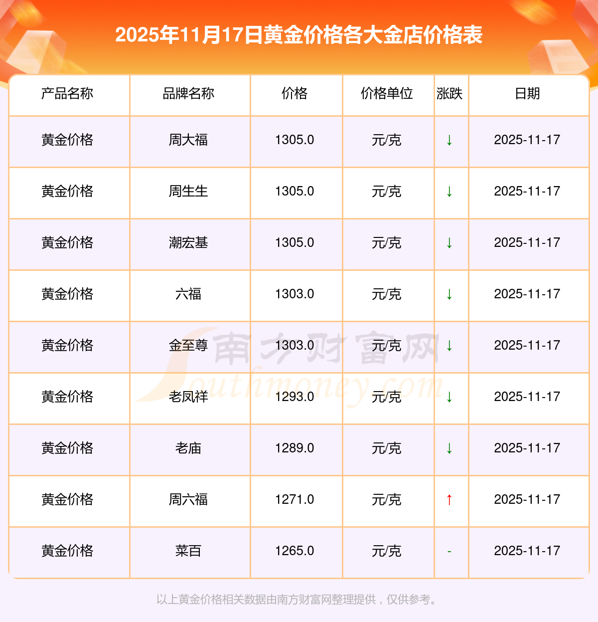 2025年11月17日周大福、周大福、周大福、周大福、周大福、周大福、周大福、老凤祥、老凤祥、老凤祥、周六福等各大金店品牌黄金价格最新价格如下:周大福黄金价格1305.0元/克,周大福铂金价格626.0元/克,周大福饰品金价(内地)1305.0元/克,周大福黄金饰品(香港)45350.0,周大福铂金价格(香港)17860.0,周大福金条价格(香港)40910.0,周大福金条金价(内地)1141.0元/克,老凤祥黄金价格1293.0元/克,老凤祥铂金价格600.0元/克,老凤祥足金价格1293.0元/克,周六福黄金价格1271.0元/克。