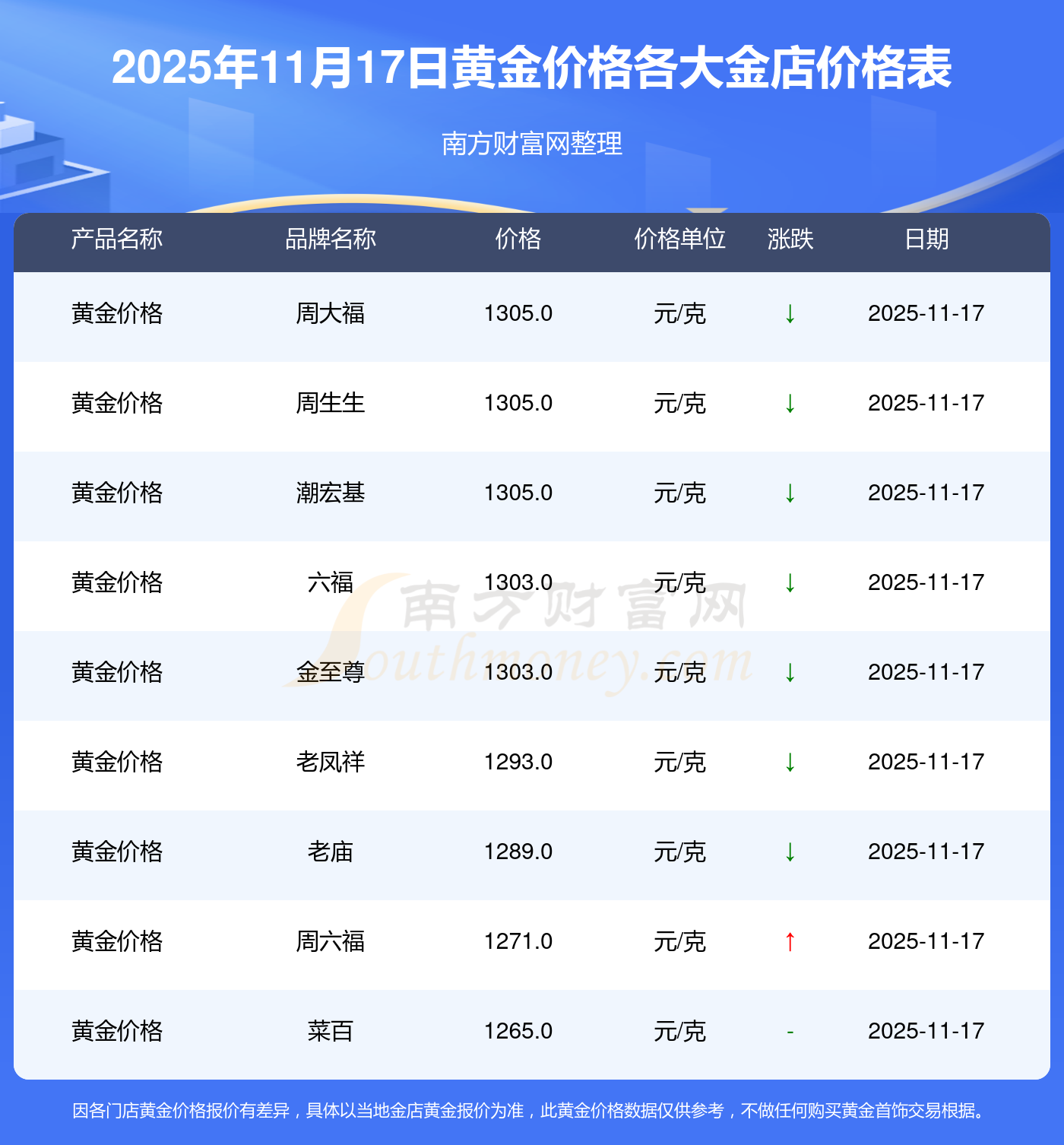2025年11月17日,周大福、周大福、周大福、周大福、周大福、周大福、周大福、老凤祥、老凤祥、老凤祥、周六福等各大金店品牌黄金价格今日价格如下:周大福1305.0元/克、周大福626.0元/克、周大福1305.0元/克、周大福45350.0、周大福17860.0、周大福40910.0、周大福1141.0元/克、老凤祥1293.0元/克、老凤祥600.0元/克、老凤祥1293.0元/克、周六福1271.0元/克。