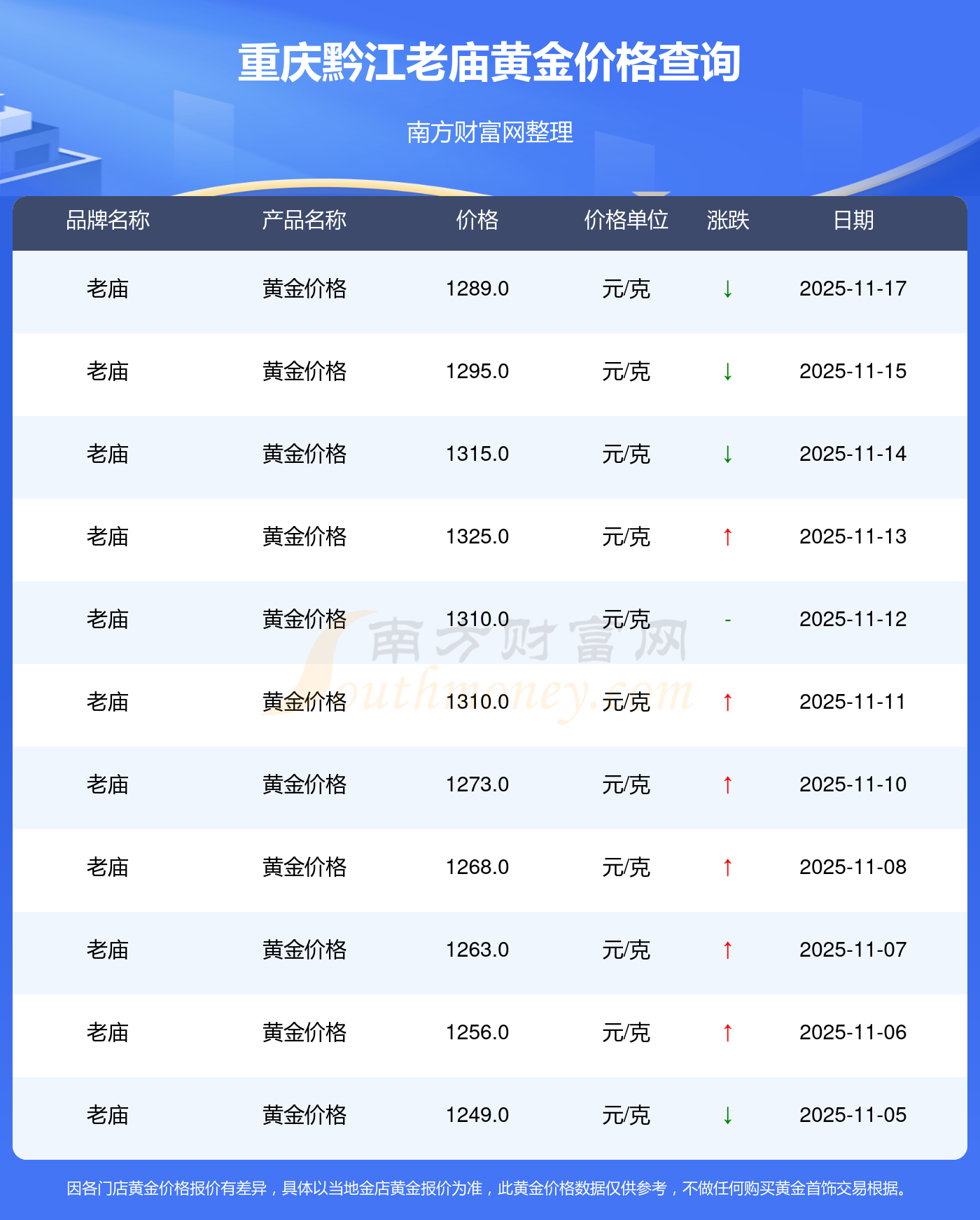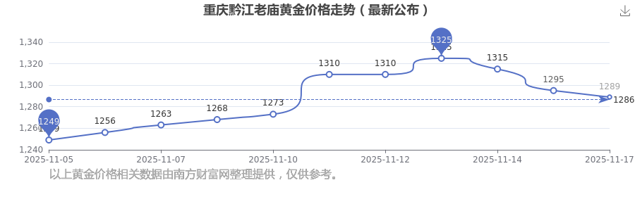 今日(2025年11月17日),1289.0元/克是重庆黔江老庙黄金价格的价格标准。