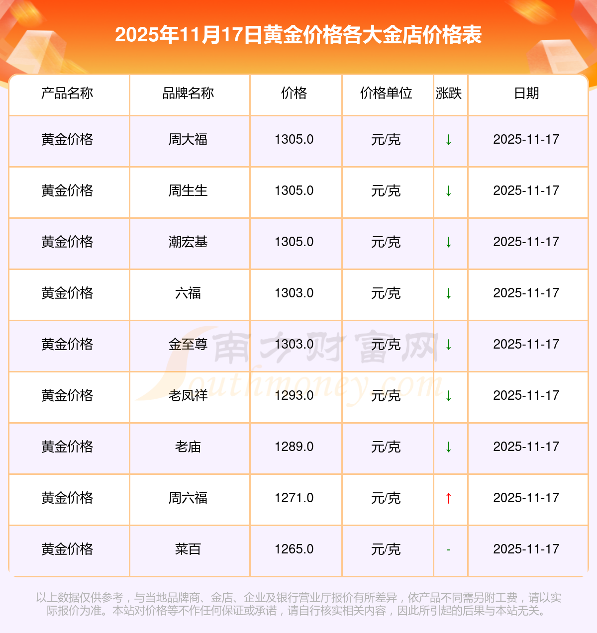 2025年11月17日周大福、周大福、周大福、周大福、周大福、周大福、周大福、老凤祥、老凤祥、老凤祥、周六福等各大金店品牌黄金价格最新价格如下:周大福黄金价格1305.0元/克,周大福铂金价格626.0元/克,周大福饰品金价(内地)1305.0元/克,周大福黄金饰品(香港)45350.0,周大福铂金价格(香港)17860.0,周大福金条价格(香港)40910.0,周大福金条金价(内地)1141.0元/克,老凤祥黄金价格1293.0元/克,老凤祥铂金价格600.0元/克,老凤祥足金价格1293.0元/克,周六福黄金价格1271.0元/克。