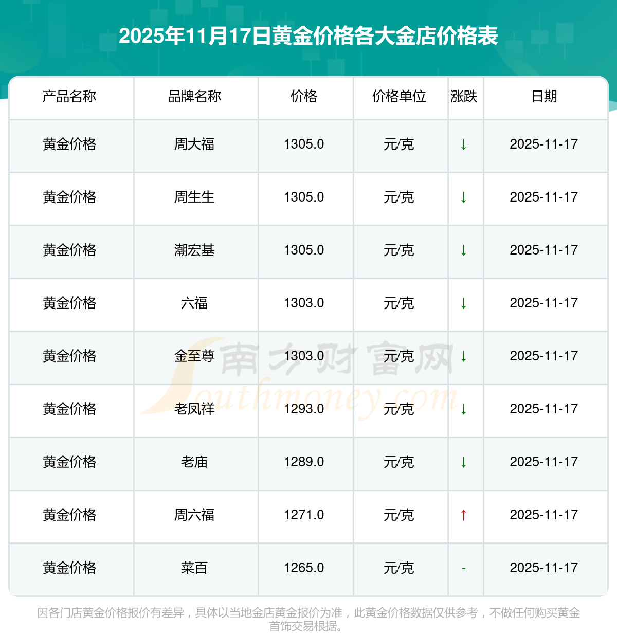 今天是2025年11月17日,周大福、周大福、周大福、周大福、周大福、周大福、周大福、老凤祥、老凤祥、老凤祥、周六福等各大金店品牌黄金价格最新价格如下:周大福1305.0元/克、周大福626.0元/克、周大福1305.0元/克、周大福45350.0、周大福17860.0、周大福40910.0、周大福1141.0元/克、老凤祥1293.0元/克、老凤祥600.0元/克、老凤祥1293.0元/克、周六福1271.0元/克。