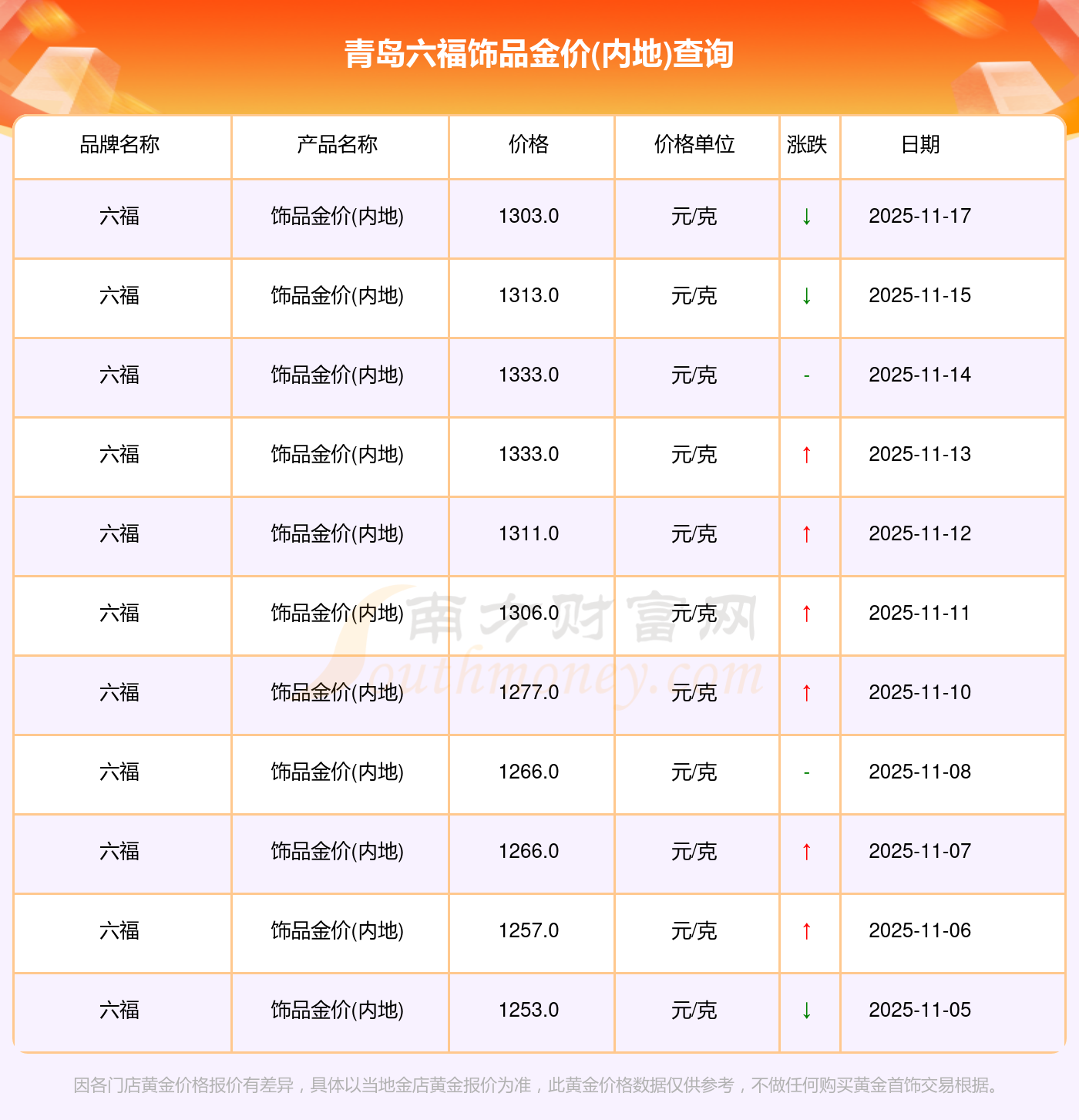 今日(2025年11月17日),青岛六福饰品金价(内地)每克的价值为1303.0元/克。