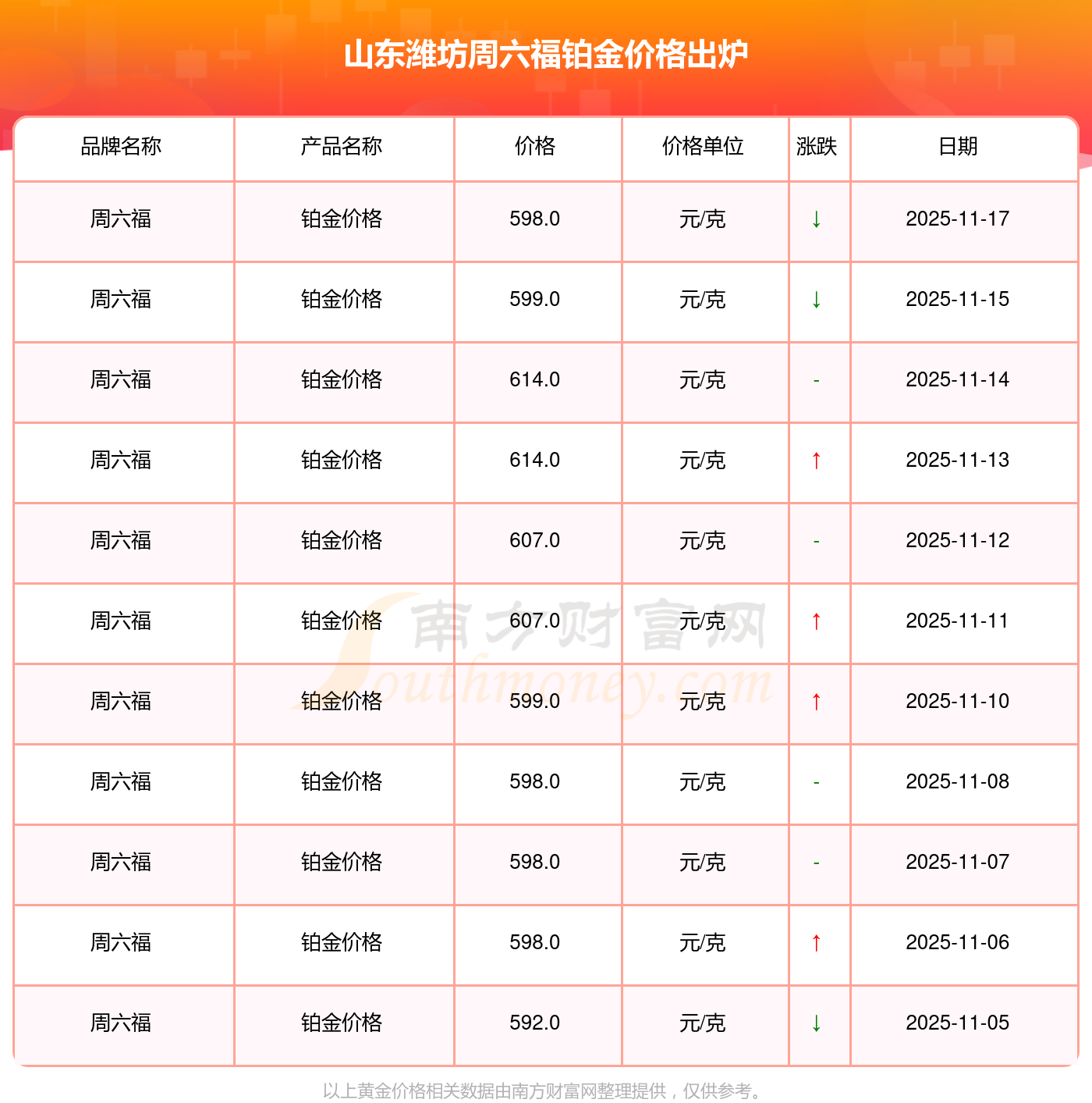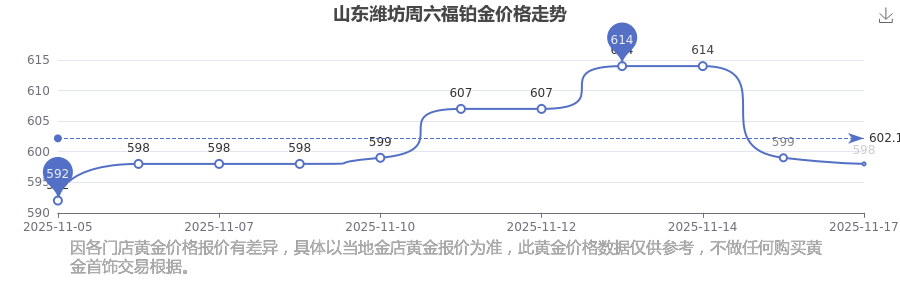 于 2025年11月17日,山东潍坊周六福铂金价格的克价为598.0元/克。