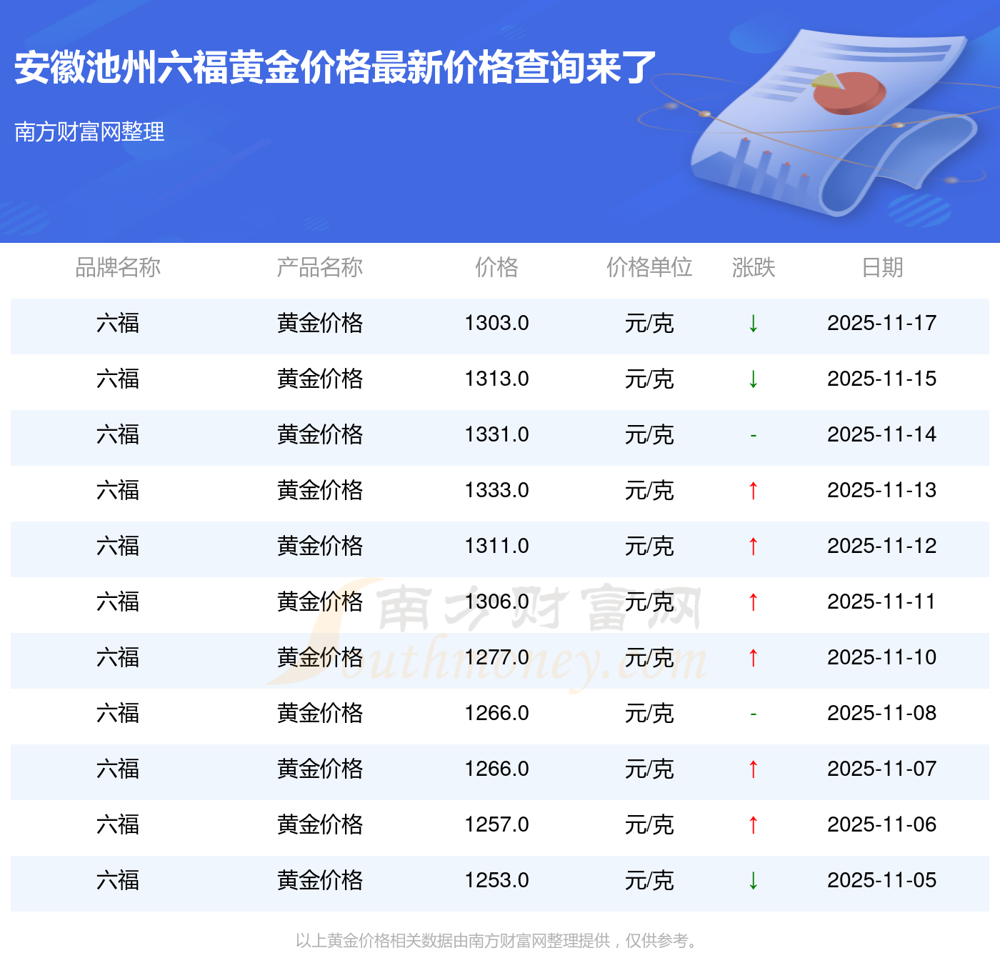 安徽池州六福今日黄金价格最新公布(当下购买一克黄金的价格是多少)?今日安徽池州六福黄金价格查询,(2025年11月17日)今日安徽池州六福黄金价格是1303.0元/克。