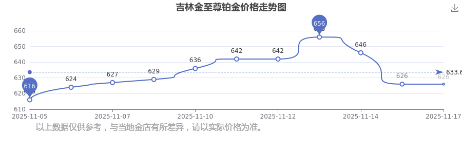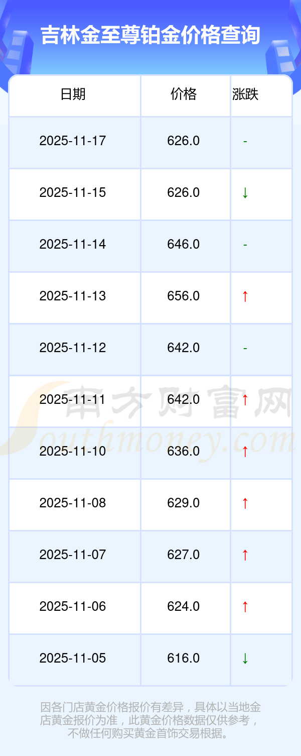 吉林金至尊在 2025年11月17日,铂金价格的售卖价格是 626.0元/克。