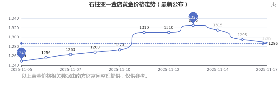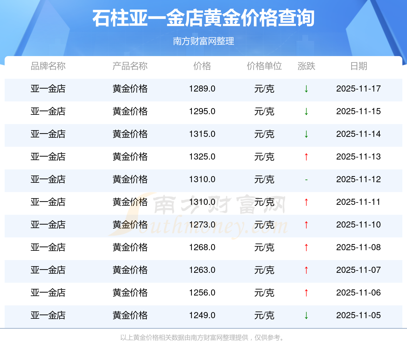 石柱亚一金店在 2025年11月17日,黄金价格的售卖价格是 1289.0元/克。