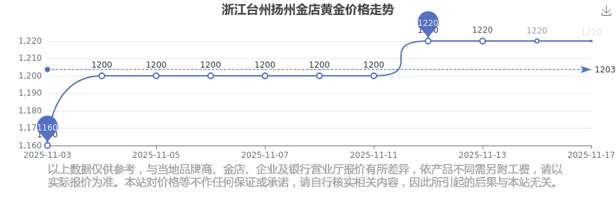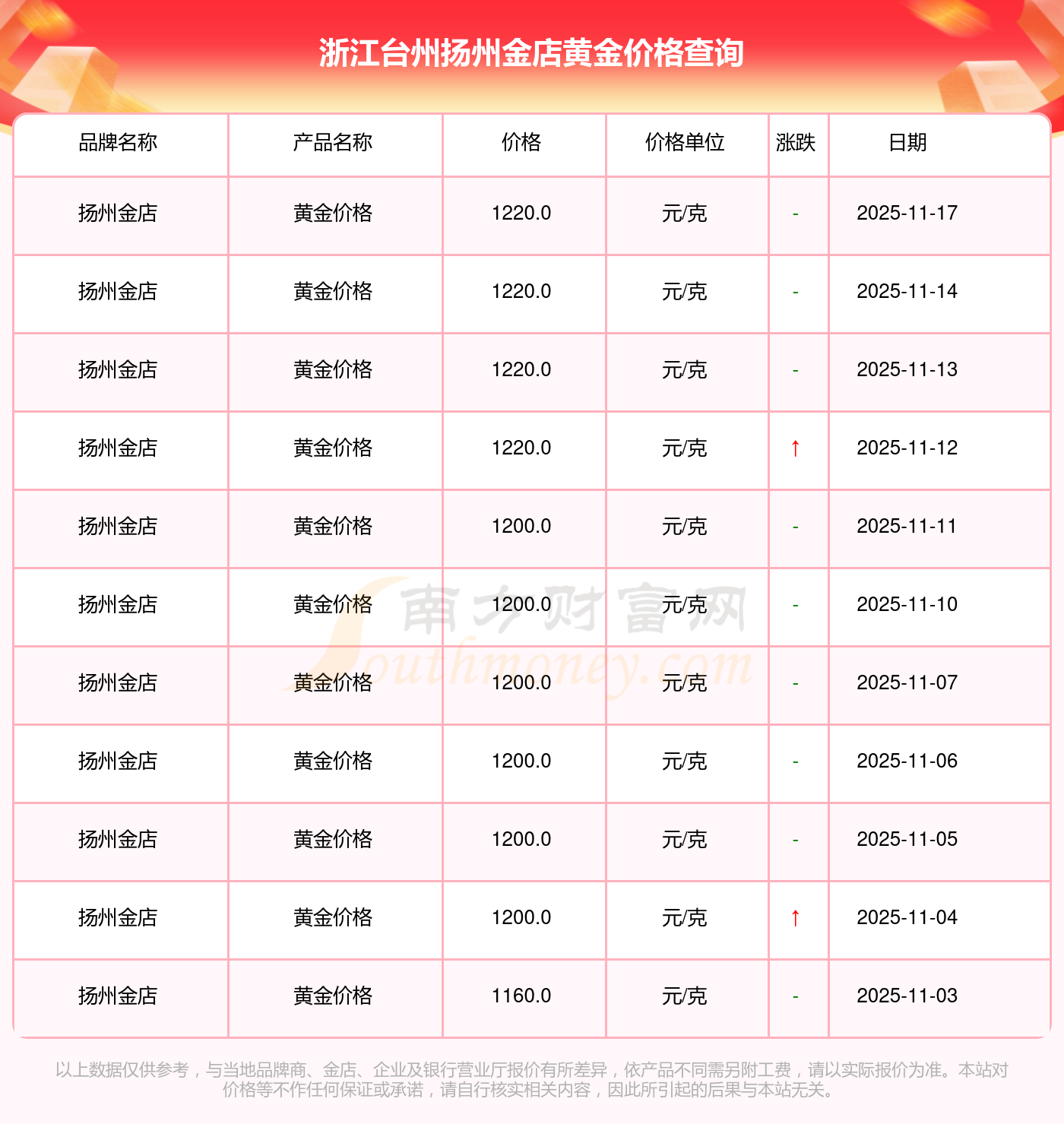 今日浙江台州扬州金店黄金价格是1220.0元/克。