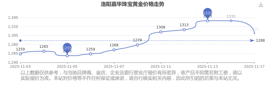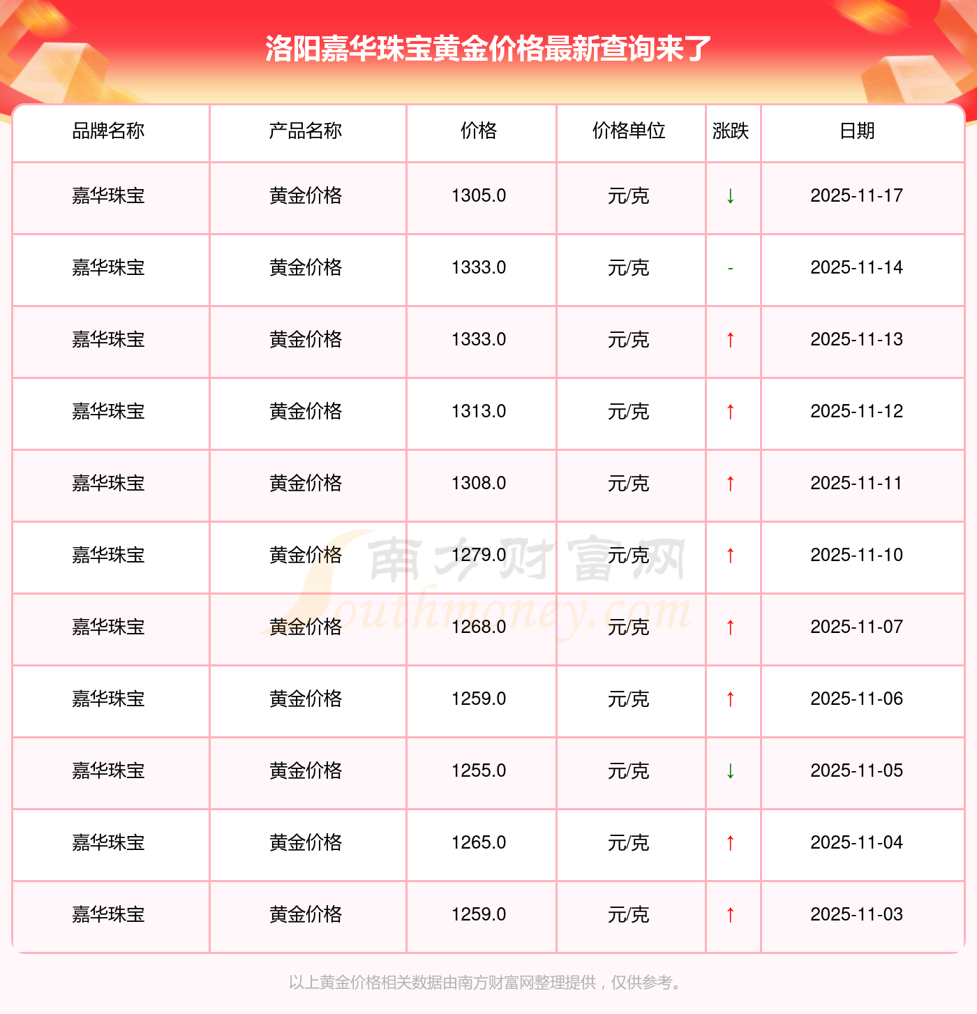 2025年11月17日洛阳嘉华珠宝黄金价格为1305.0元/克。