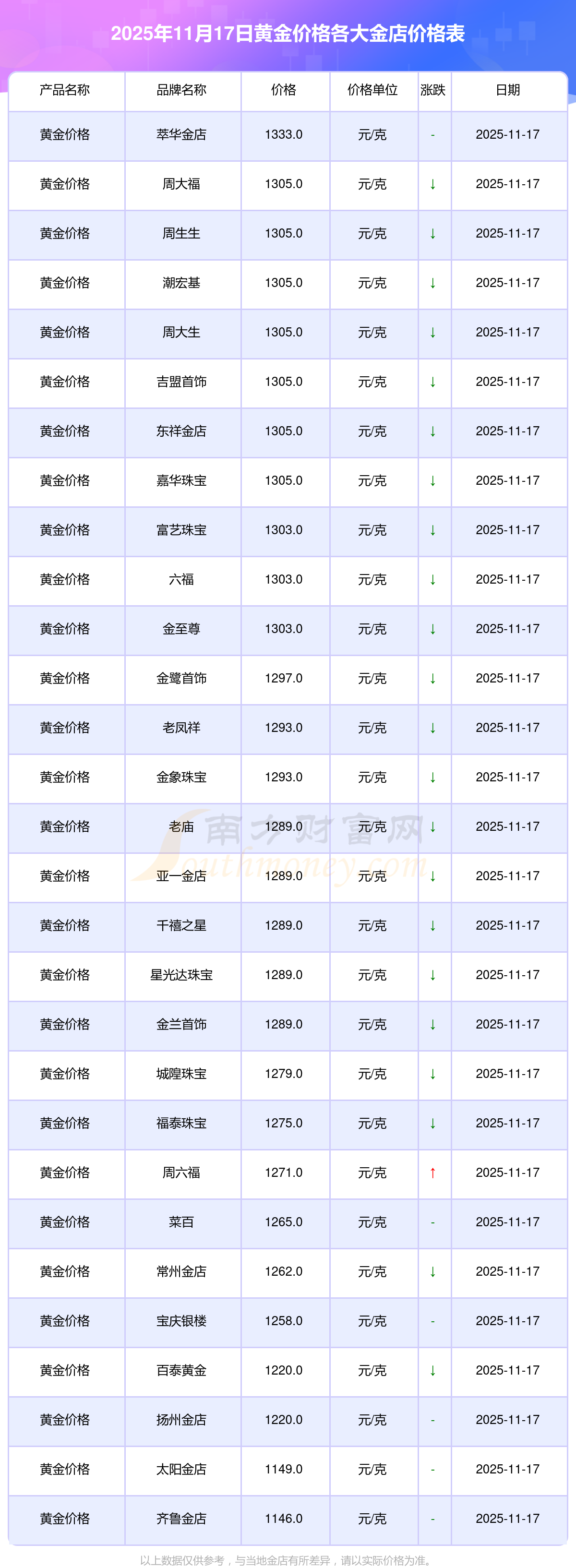 2025年11月17日各大金店黄金价格最新价格:谢瑞麟1305.0元/克,谢瑞麟46270.0,谢瑞麟13490.0,谢瑞麟41990.0,金银街1280.0元/克,金银街1295.0元/克,金银街1285.0元/克,金银街11.5元/克,金银街921.0元/克,金银街10.7元/克,多边金都珠宝1256.0元/克。