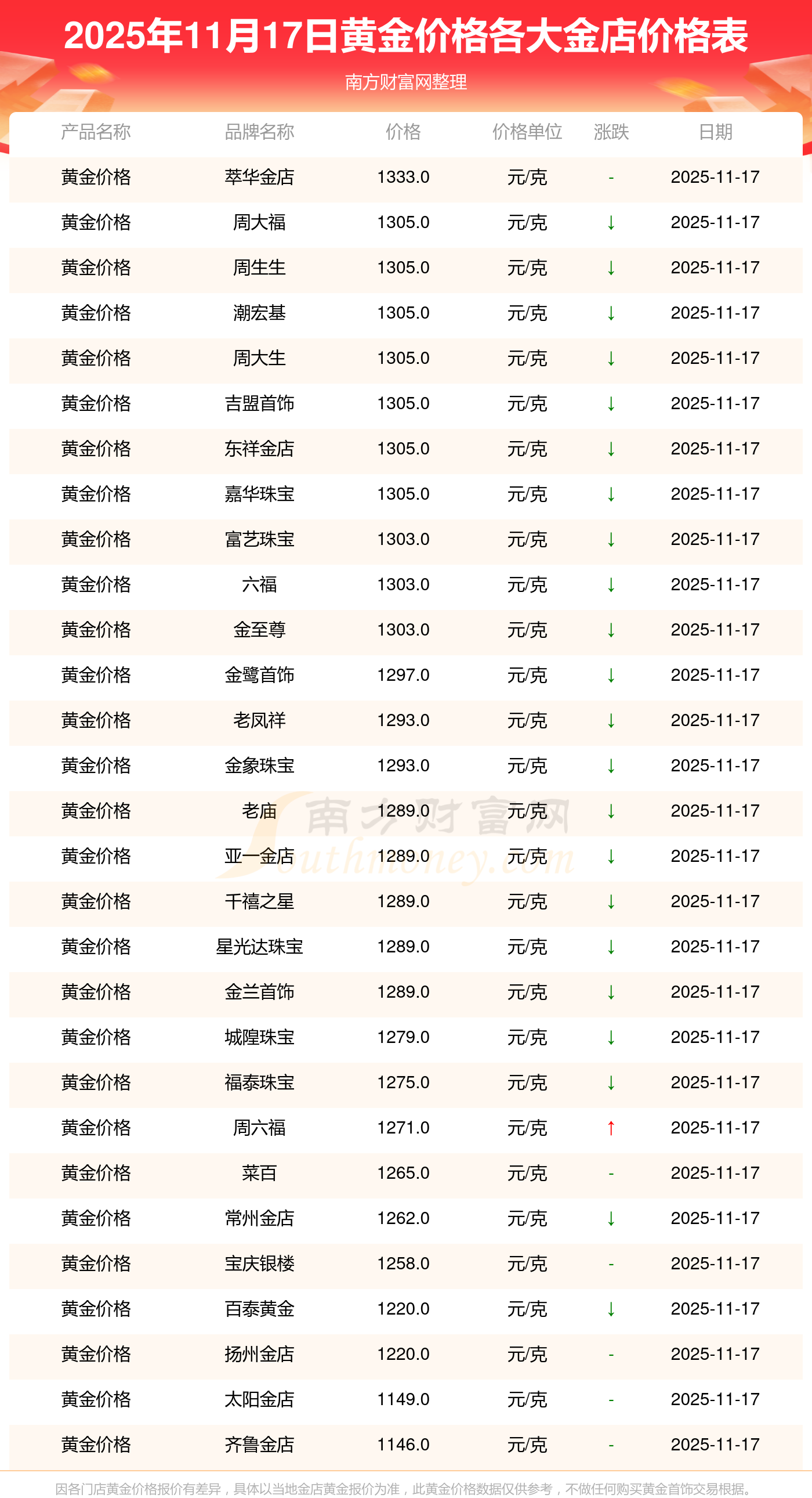 2025年11月17日,谢瑞麟、谢瑞麟、谢瑞麟、谢瑞麟、金银街、金银街、金银街、金银街、金银街、金银街、多边金都珠宝等各大金店品牌黄金价格今日价格如下:谢瑞麟1305.0元/克、谢瑞麟46270.0、谢瑞麟13490.0、谢瑞麟41990.0、金银街1280.0元/克、金银街1295.0元/克、金银街1285.0元/克、金银街11.5元/克、金银街921.0元/克、金银街10.7元/克、多边金都珠宝1256.0元/克。