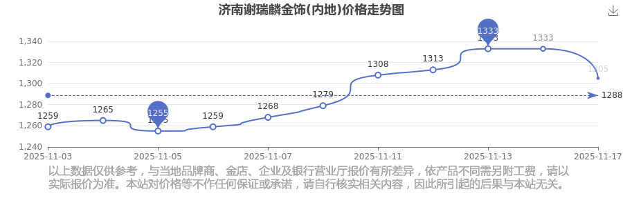 今日济南谢瑞麟金饰(内地)价格最新为:1305.0元/克。