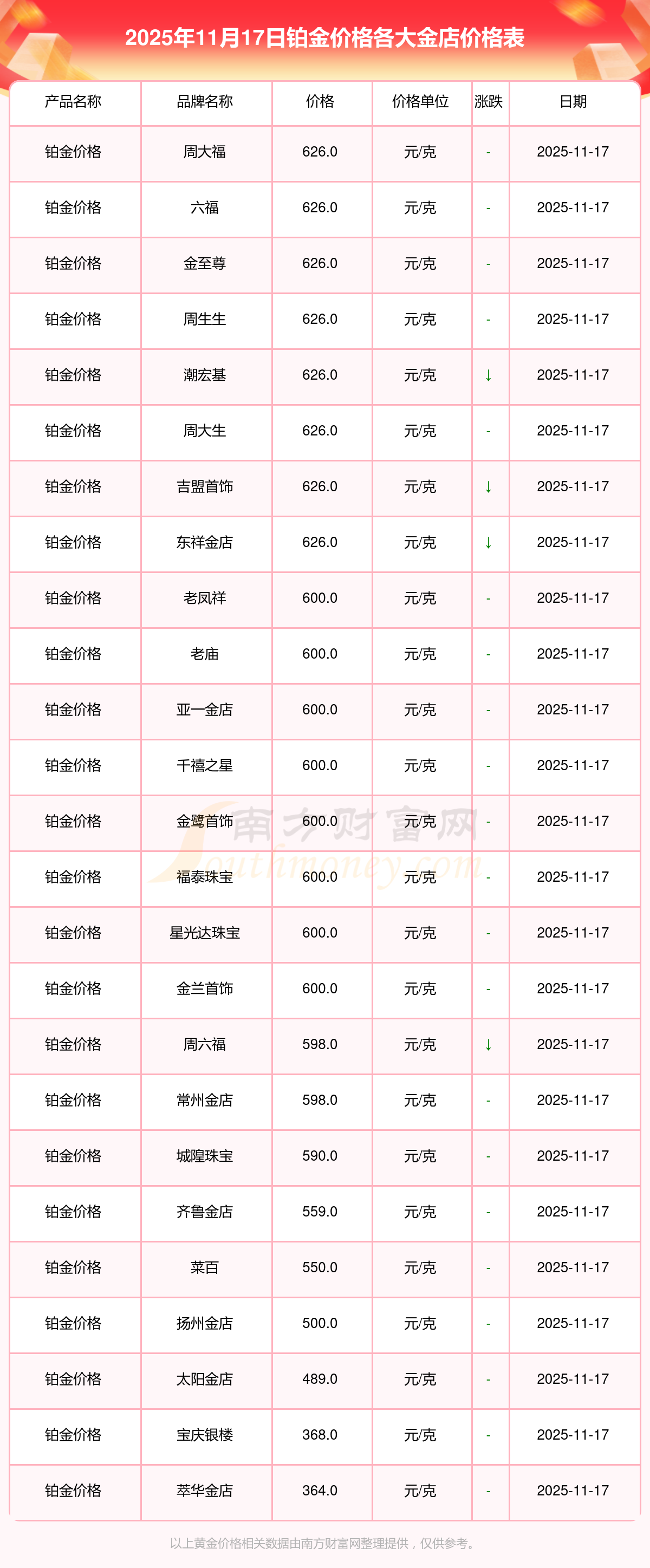 2025年11月17日,谢瑞麟、谢瑞麟、谢瑞麟、谢瑞麟、金银街、金银街、金银街、金银街、金银街、金银街、多边金都珠宝等各大金店品牌铂金价格今日价格如下:谢瑞麟1305.0元/克、谢瑞麟46270.0、谢瑞麟13490.0、谢瑞麟41990.0、金银街1280.0元/克、金银街1295.0元/克、金银街1285.0元/克、金银街11.5元/克、金银街921.0元/克、金银街10.7元/克、多边金都珠宝1256.0元/克。