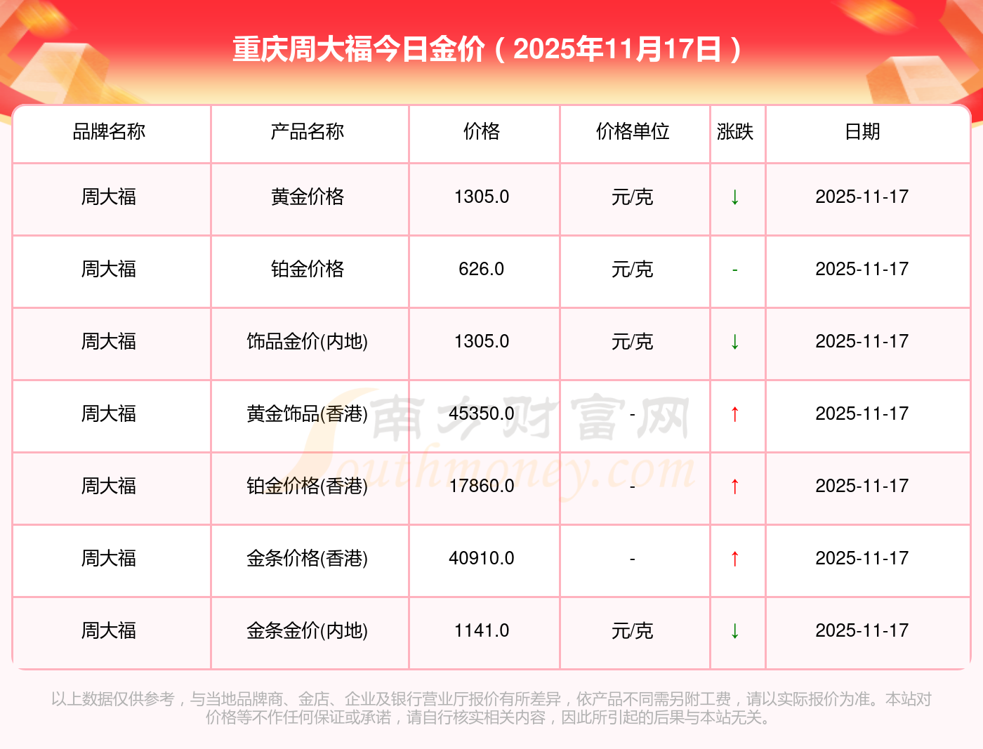 2025年11月17日重庆周大福黄金的单价,一克为多少?金饰价格(内地)1305.0元/克,黄金饰品(香港)46270.0,铂金饰品(香港)13490.0,金条金价(香港)41990.0,投资金条1280.0元/克,工艺金条1295.0元/克,千足金首饰1285.0元/克,投资银条11.5元/克,黄金回购921.0元/克,白银回购10.7元/克,千足金饰品1256.0元/克。