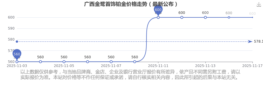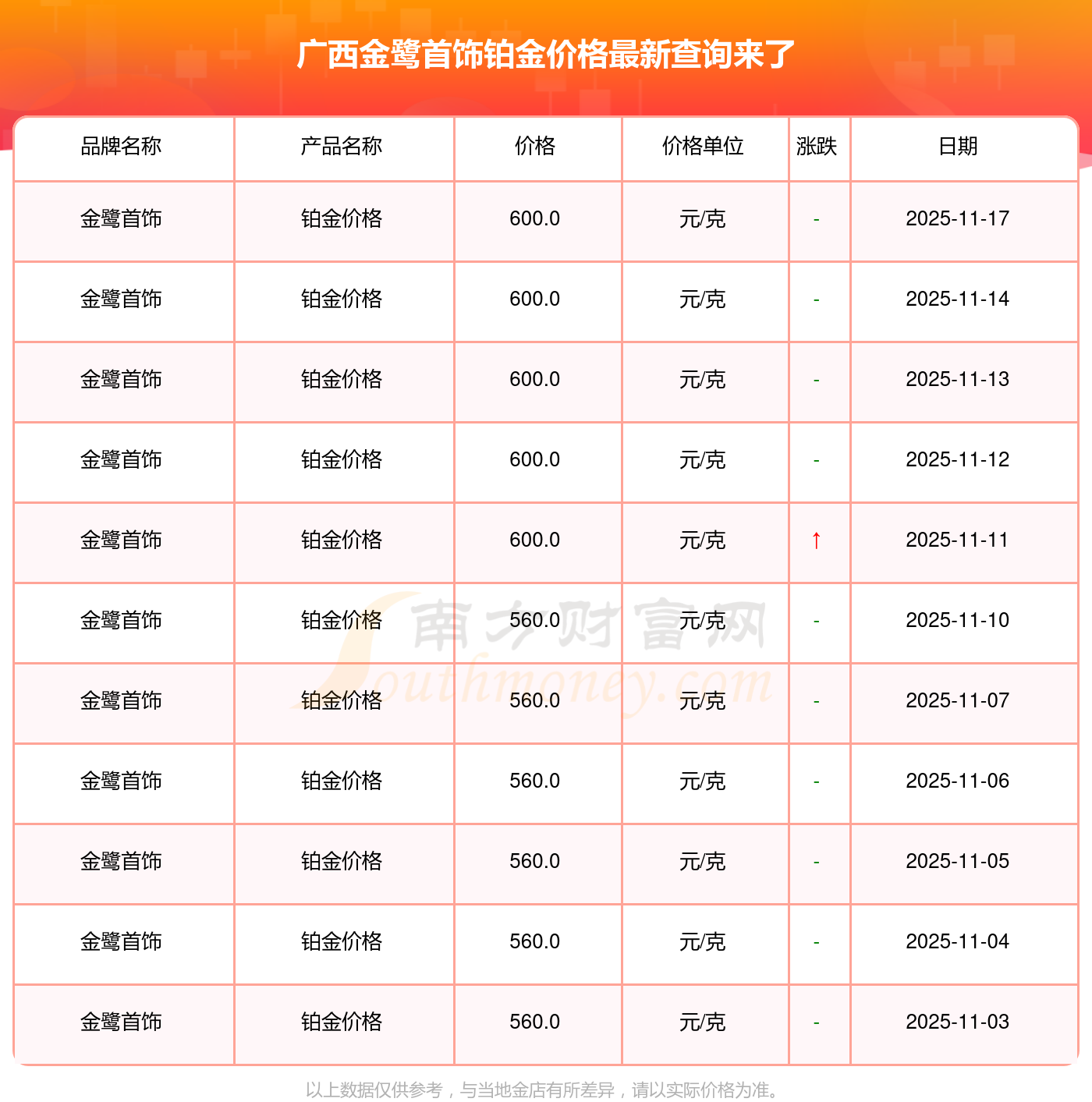 广西金鹭首饰铂金价格在 2025年11月17日为 600.0元/克。
