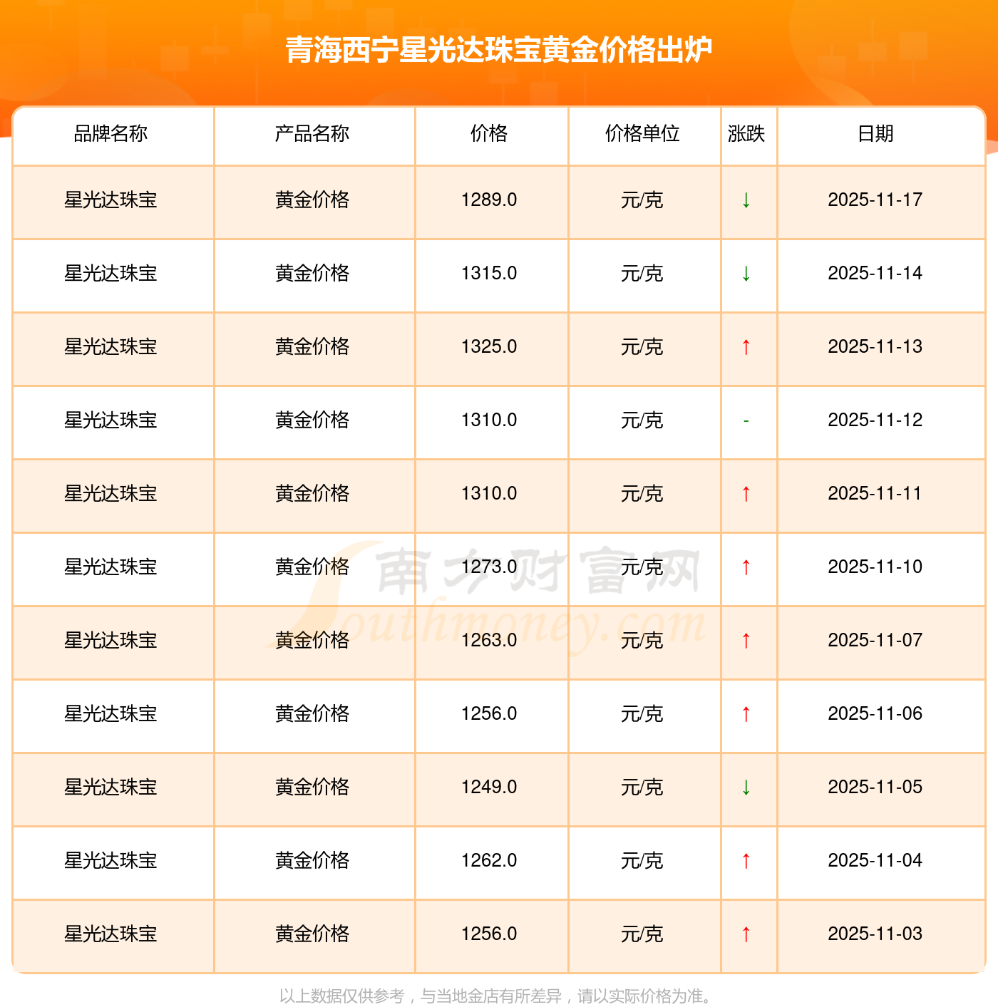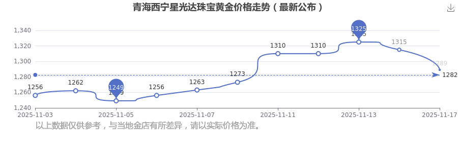 2025年11月17日,今日青海西宁星光达珠宝黄金价格:1289.0元/克。
