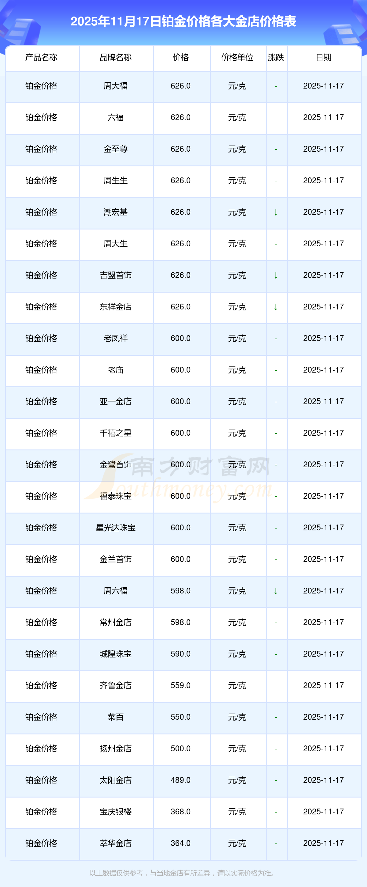 2025年11月17日各大金店铂金价格最新价格:谢瑞麟1305.0元/克,谢瑞麟46270.0,谢瑞麟13490.0,谢瑞麟41990.0,金银街1280.0元/克,金银街1295.0元/克,金银街1285.0元/克,金银街11.5元/克,金银街921.0元/克,金银街10.7元/克,多边金都珠宝1256.0元/克。