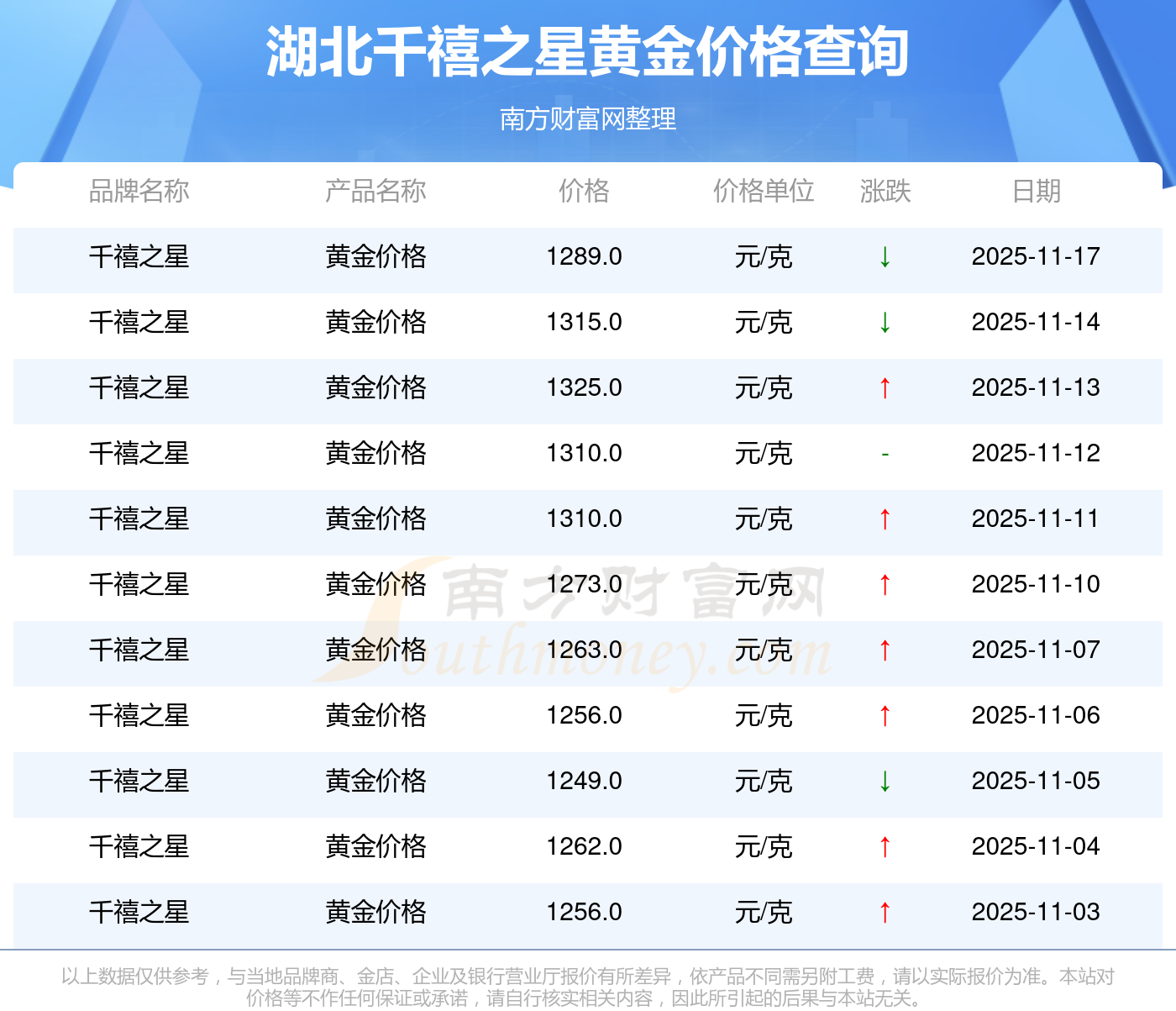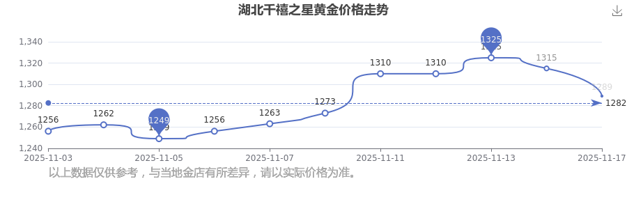 (2025年11月17日)湖北千禧之星黄金价格现在为1289.0元/克。