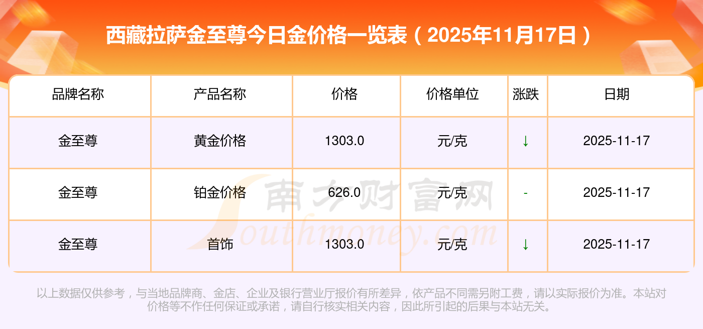 2025年11月17日西藏拉萨金至尊现在购买一克黄金需要支付多少钱?金饰价格(内地)1305.0元/克,黄金饰品(香港)46270.0,铂金饰品(香港)13490.0,金条金价(香港)41990.0,投资金条1280.0元/克,工艺金条1295.0元/克,千足金首饰1285.0元/克,投资银条11.5元/克,黄金回购921.0元/克,白银回购10.7元/克,千足金饰品1256.0元/克。