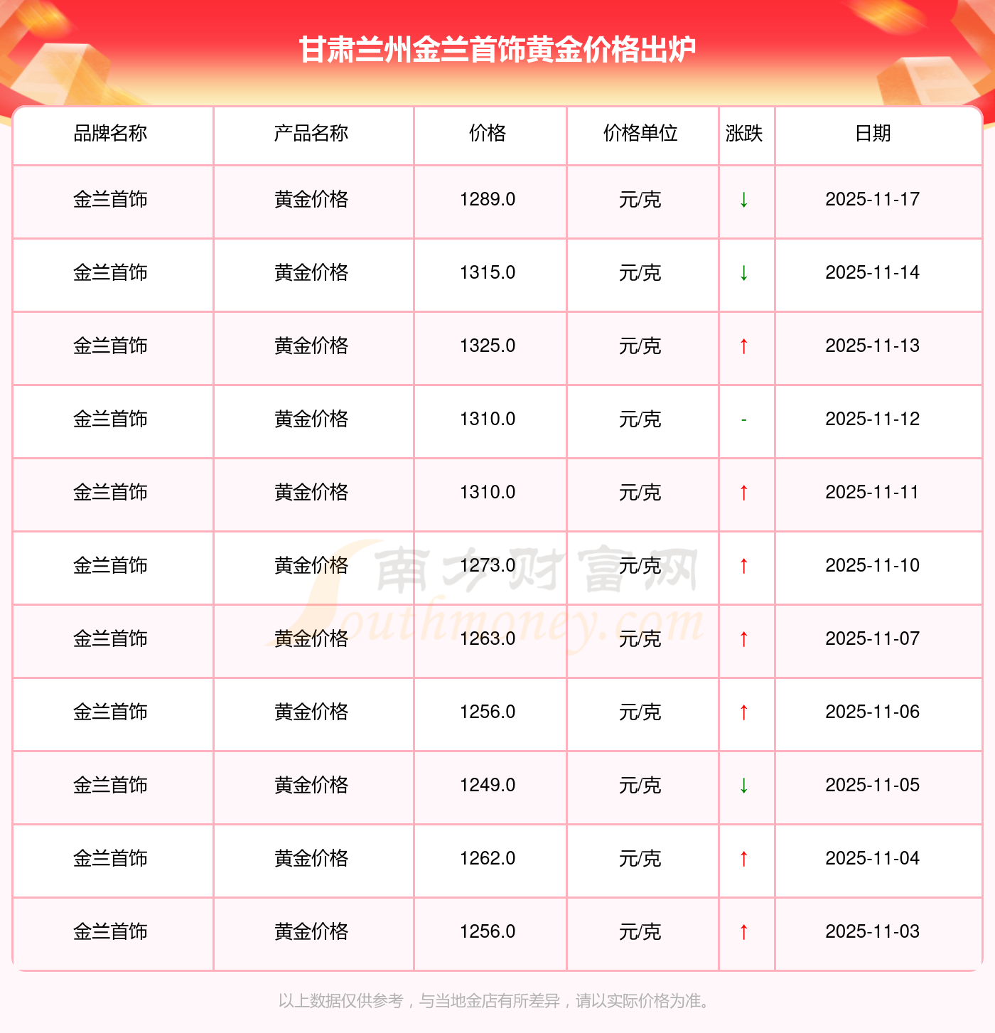 今日(2025年11月17日),甘肃兰州金兰首饰黄金价格的定价为 1289.0元/克。