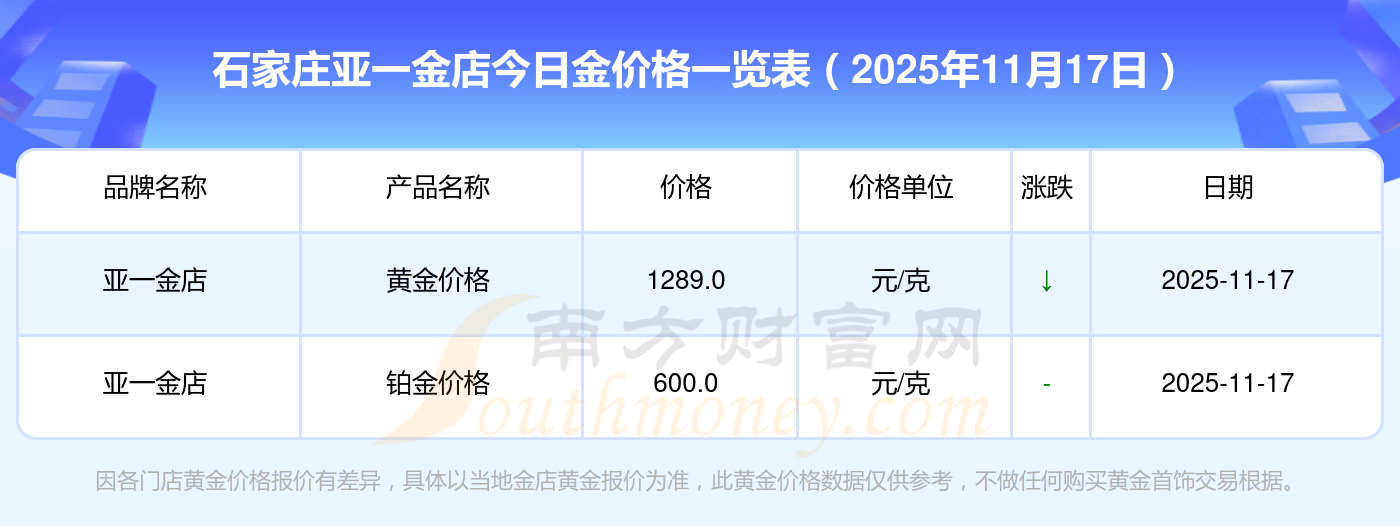 石家庄亚一金店每克黄金在市场上卖多少钱:金饰价格(内地)1305.0元/克,黄金饰品(香港)46270.0,铂金饰品(香港)13490.0,金条金价(香港)41990.0,投资金条1280.0元/克,工艺金条1295.0元/克,千足金首饰1285.0元/克,投资银条11.5元/克,黄金回购921.0元/克,白银回购10.7元/克,千足金饰品1256.0元/克。