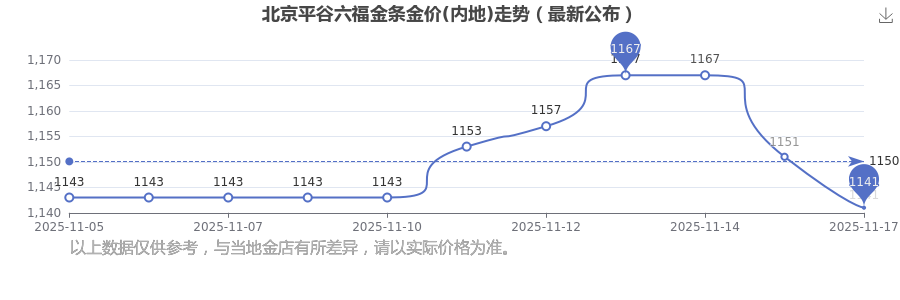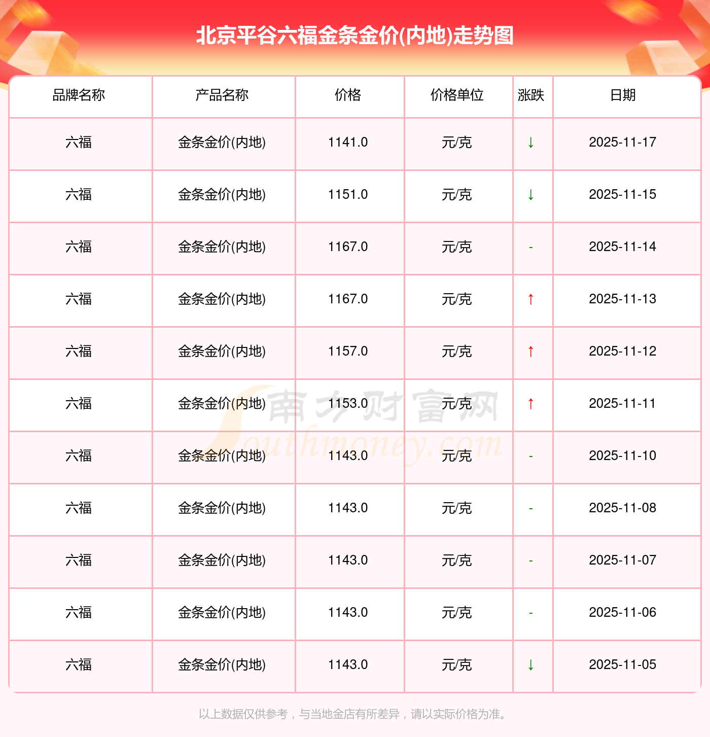 2025年11月17日,北京平谷六福金条金价(内地)每克的价值量定格在1141.0元/克。