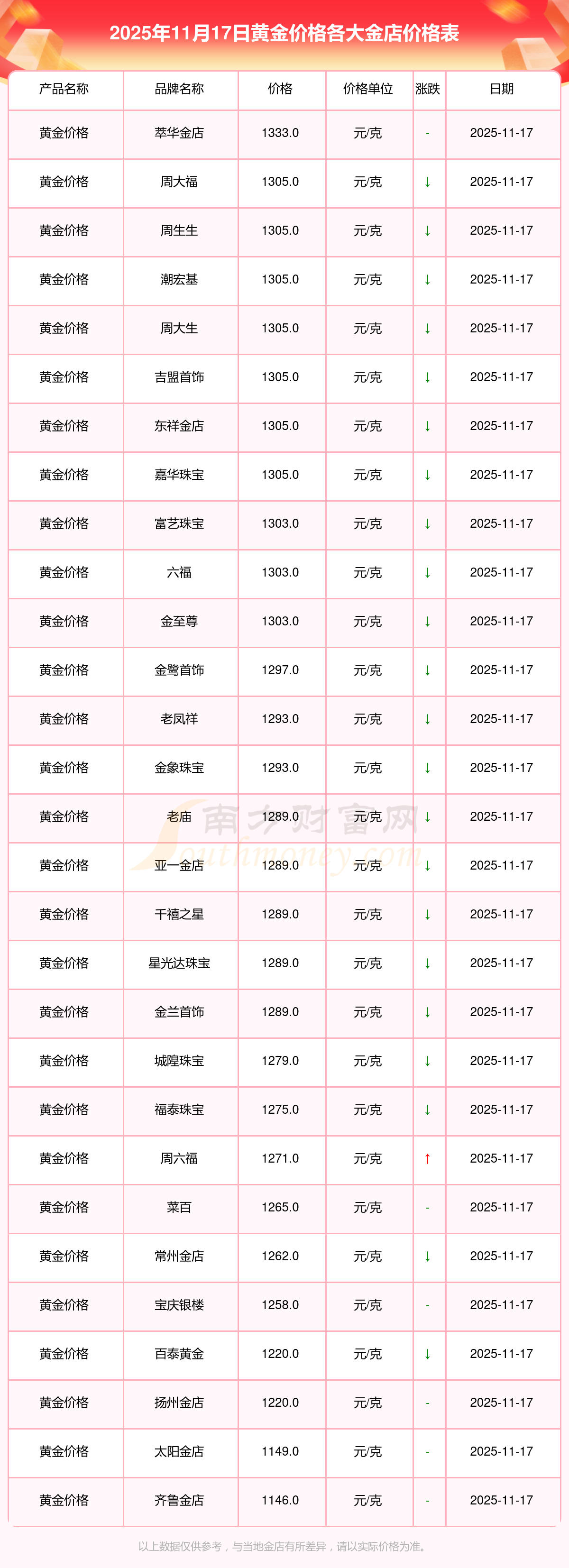 以上数据仅供参考,与当地品牌商、金店、企业及银行营业厅报价有所差异,依产品不同需另附工费,请以实际报价为准。本站对价格等不作任何保证或承诺,请自行核实相关内容,因此所引起的后果与本站无关。