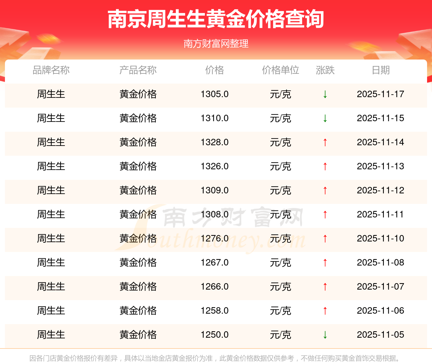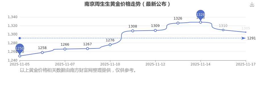 今日(2025年11月17日),南京周生生黄金价格的定价为 1305.0元/克。