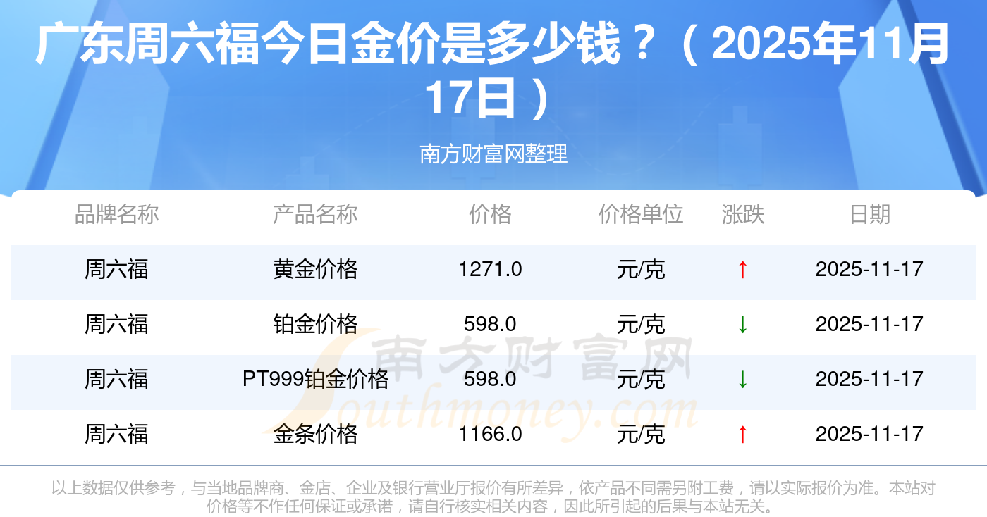 2025年11月17日广东周六福现在购买一克黄金需要支付多少钱?金饰价格(内地)1305.0元/克,黄金饰品(香港)46270.0,铂金饰品(香港)13490.0,金条金价(香港)41990.0,投资金条1280.0元/克,工艺金条1295.0元/克,千足金首饰1285.0元/克,投资银条11.5元/克,黄金回购921.0元/克,白银回购10.7元/克,千足金饰品1256.0元/克。