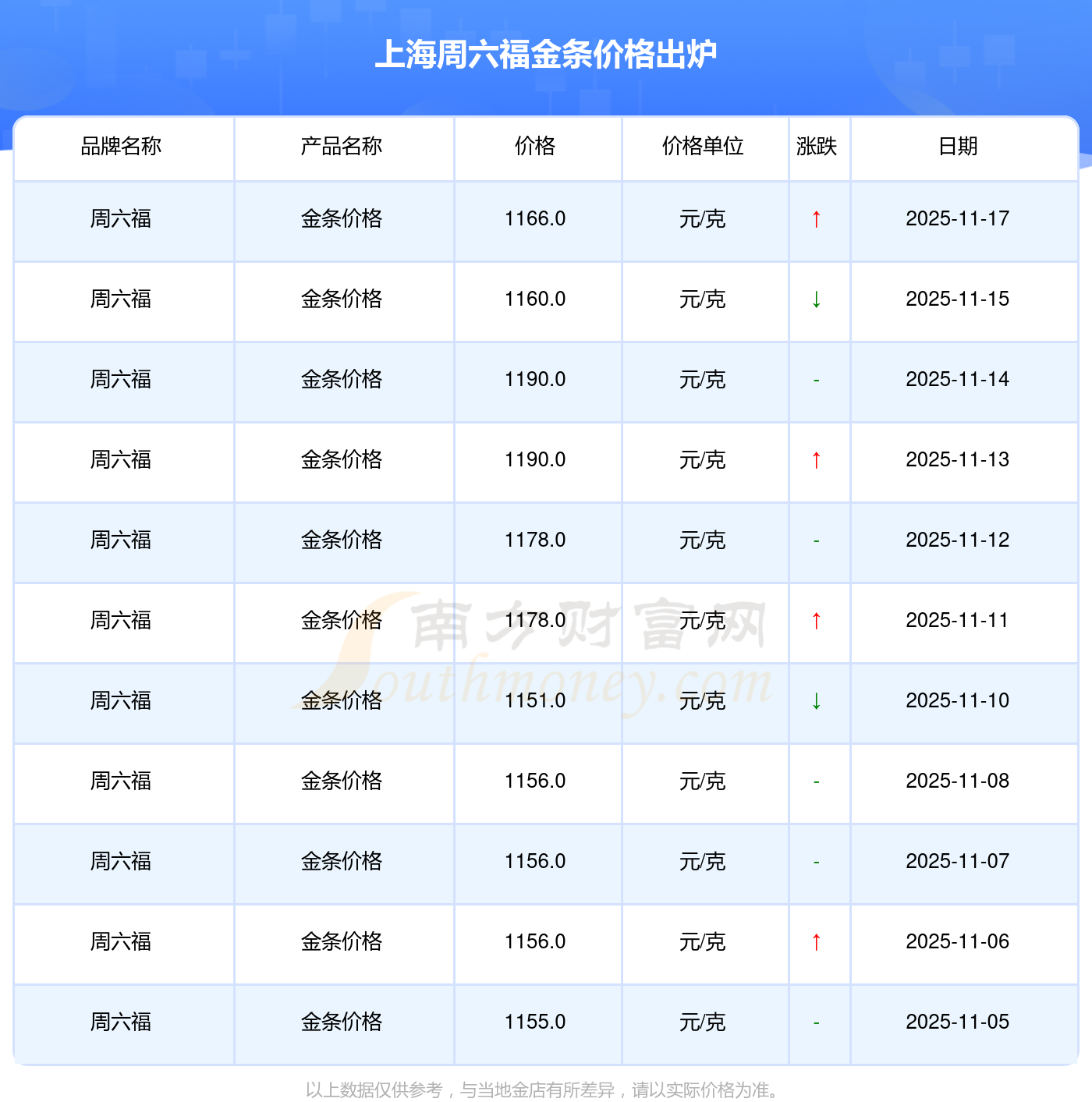 上海周六福在 2025年11月17日,金条价格的售卖价格是 1166.0元/克。